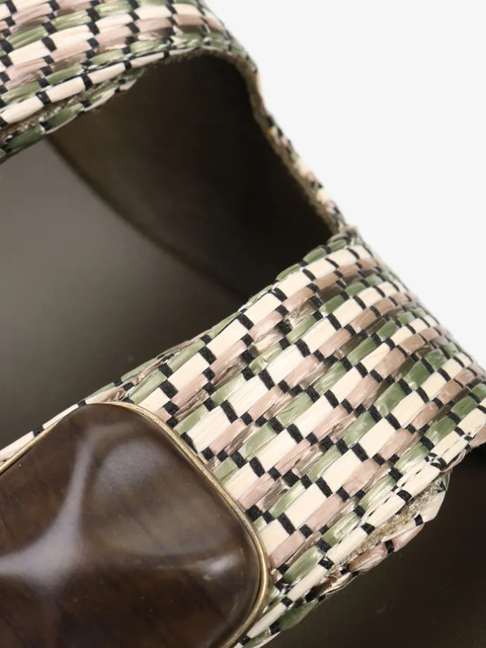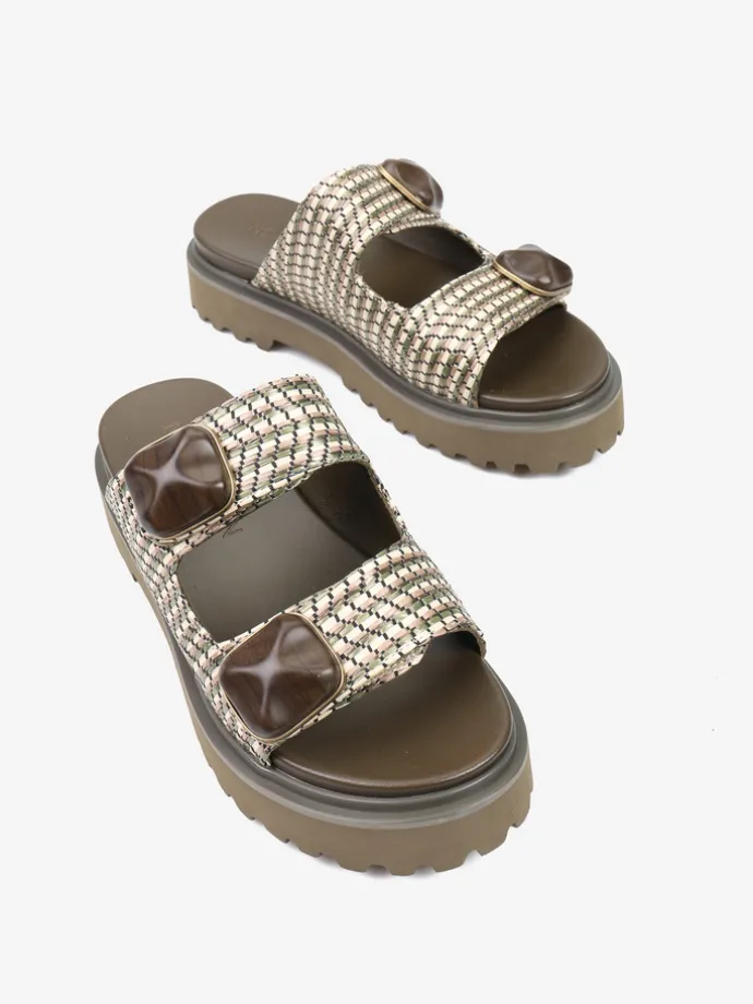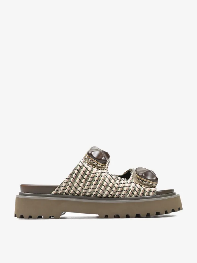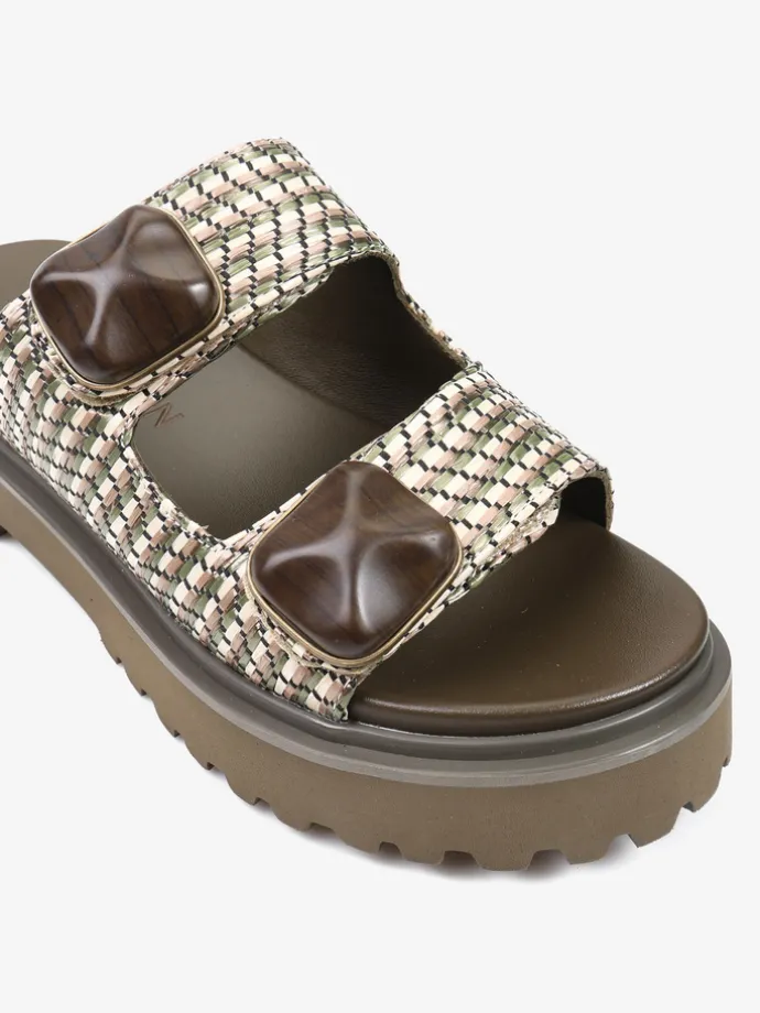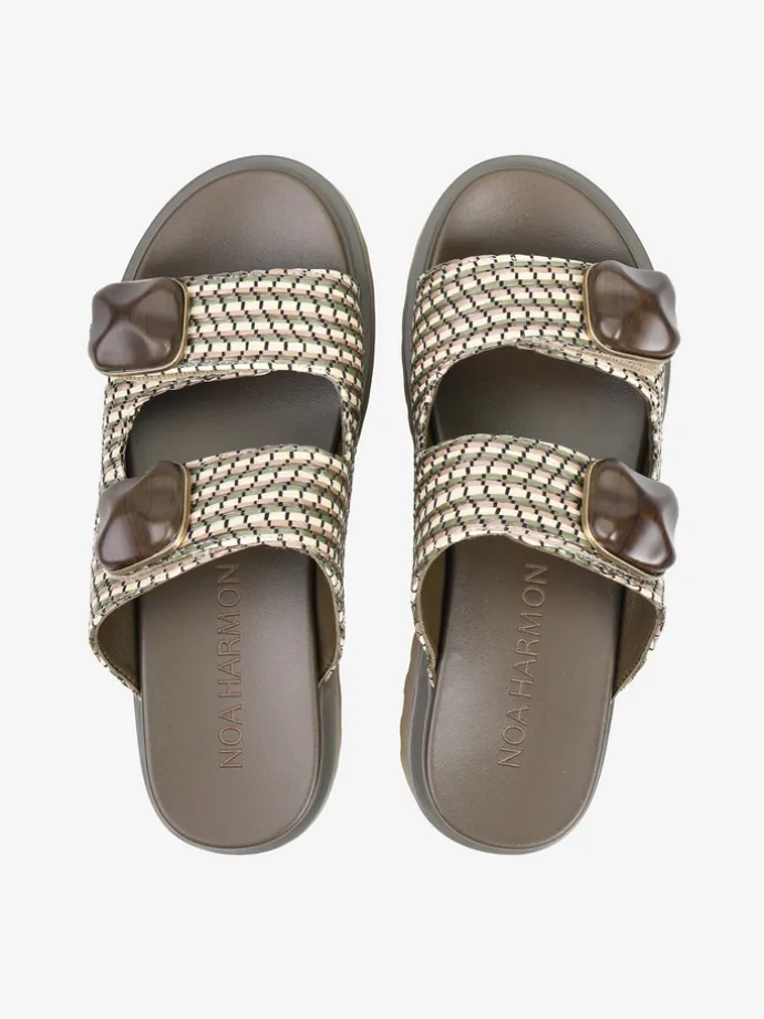 Klapki NOA HARMON z ozdobną aplikacją i plecionymi paskami zapinanymi na rzep. Podeszwa i wkładka w kolorze khaki.