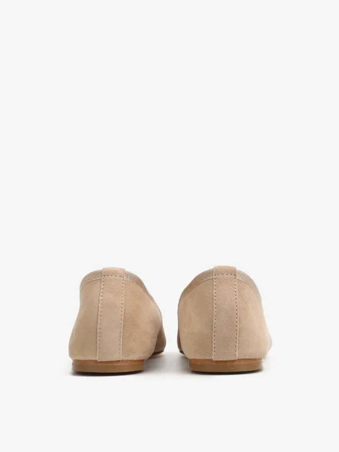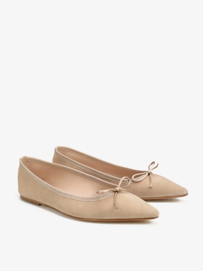 Baleriny z noskiem w szpic wykonane z modnego w tym sezonie zamszu. Wiązana kokardka umożliwia regulację dopasowania.