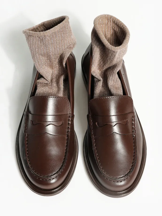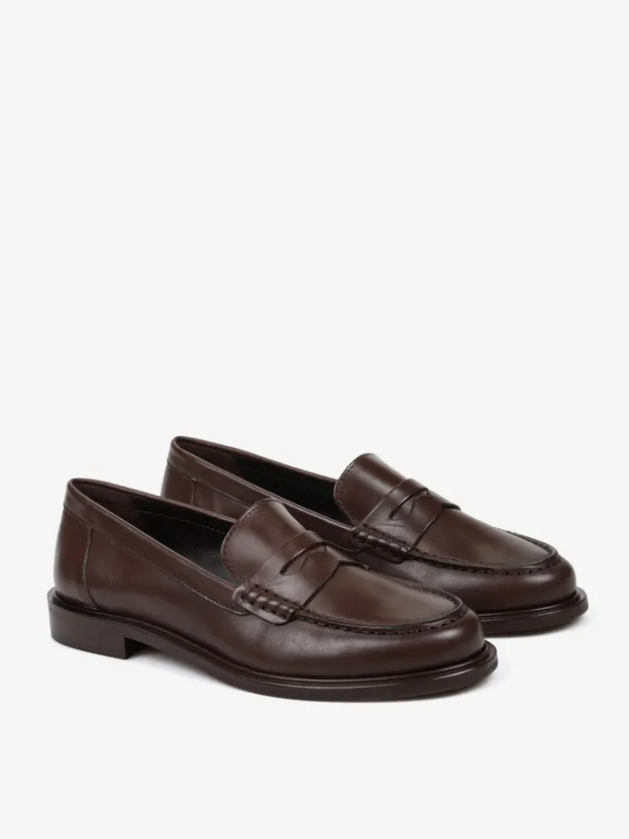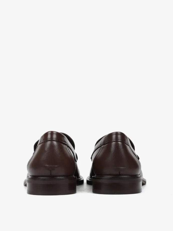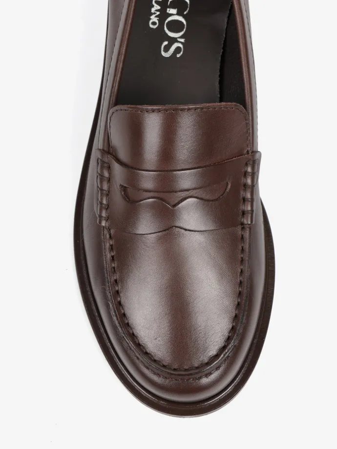 Skórzane, klasyczne mokasyny college z ozdobną patką i wysokim językiem.