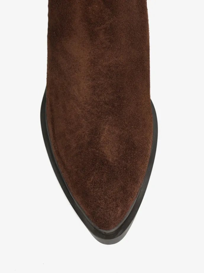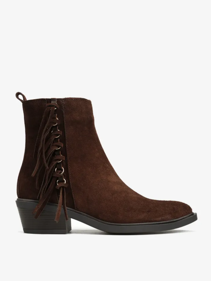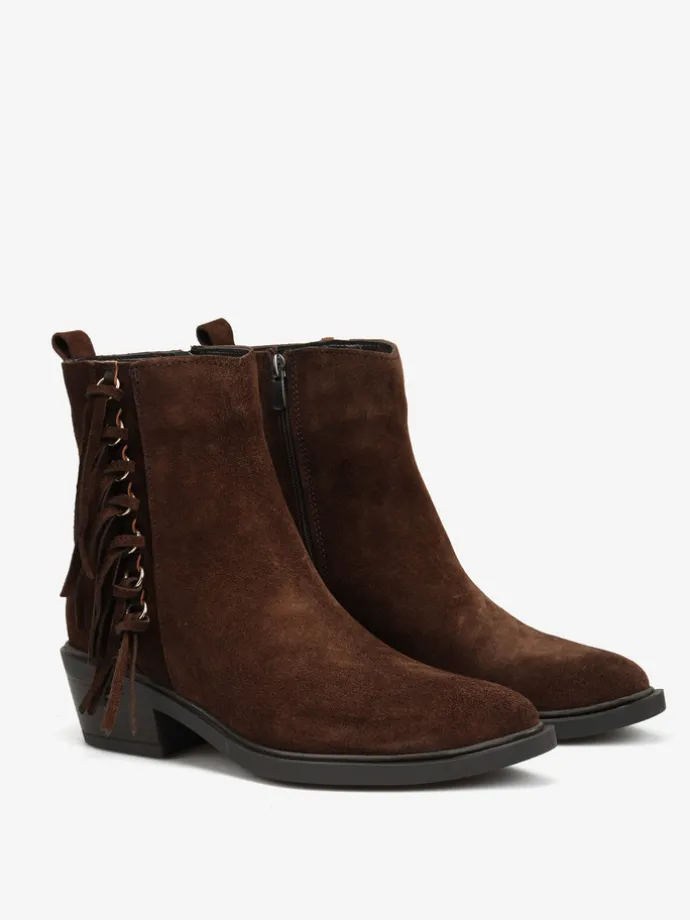 Kowbojki z ozdobnymi frędzlami i zapięciem na suwak przy kostce.