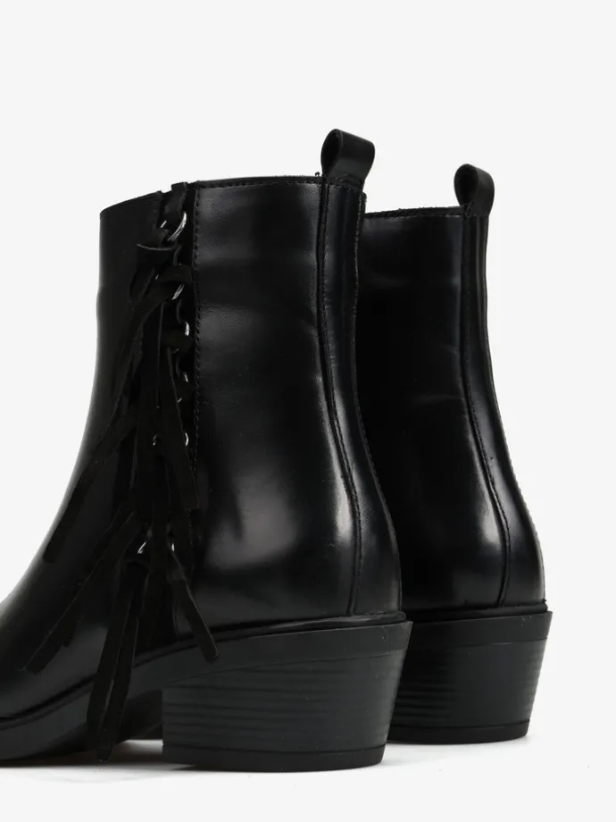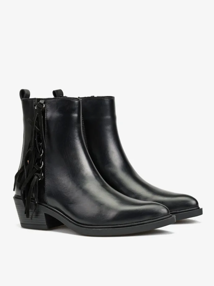 Kowbojki z ozdobnymi frędzlami i zapięciem na suwak przy kostce.