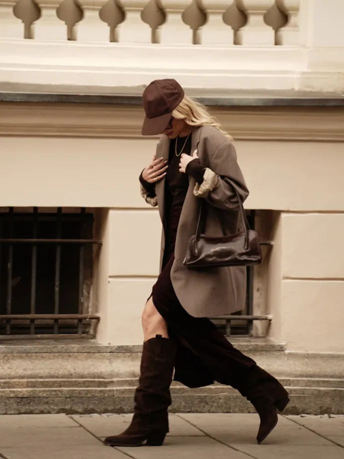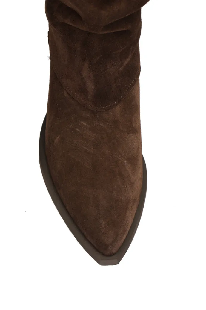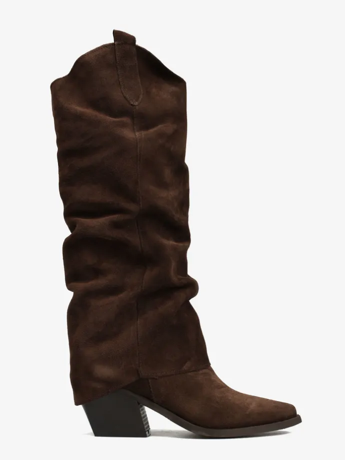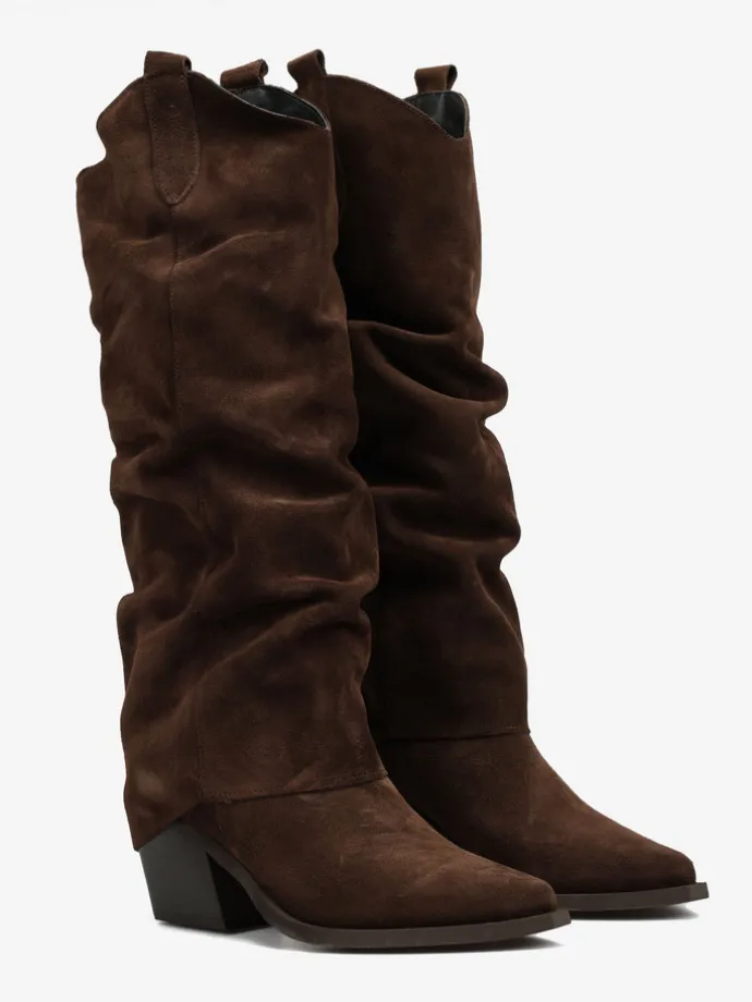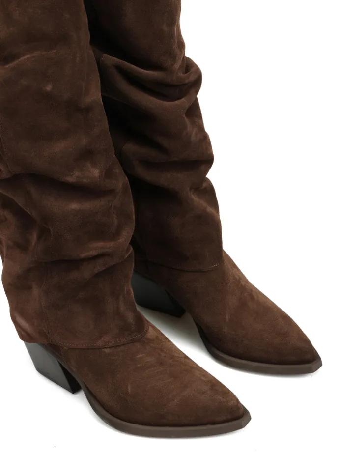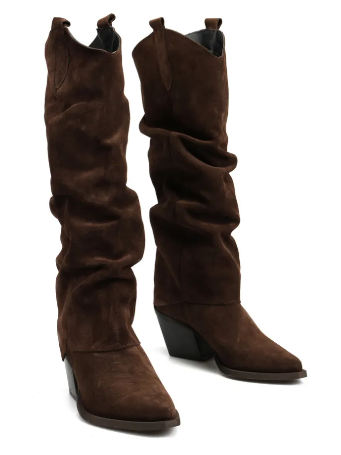 Zamszowe kowbojki z przedłużoną, marszczoną cholewką. Noski w szpic.