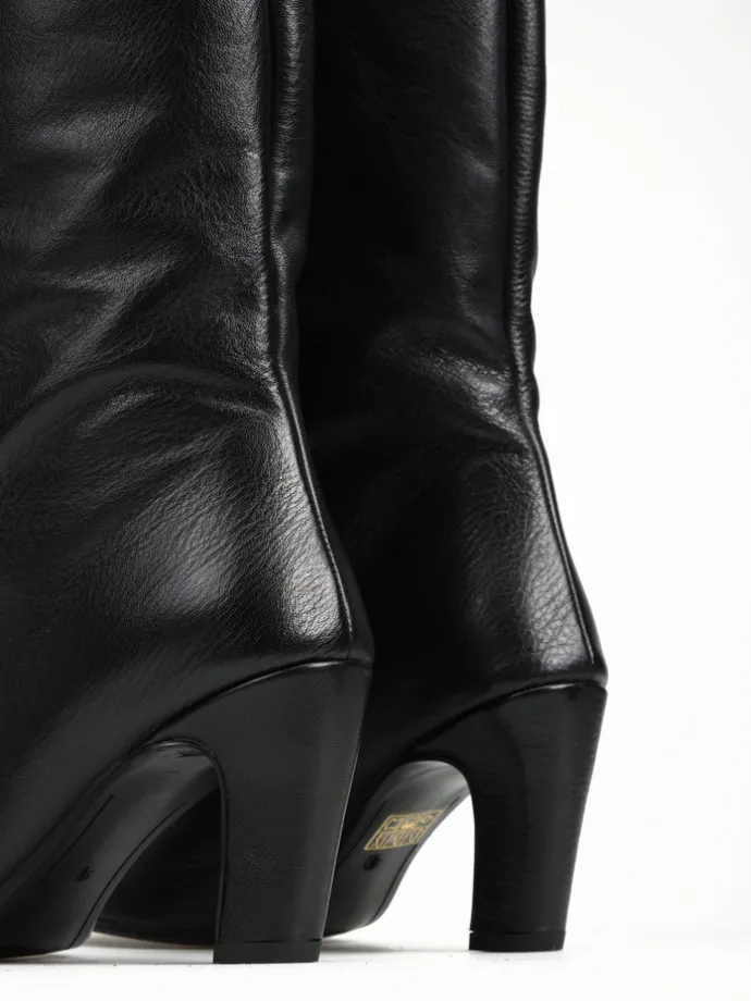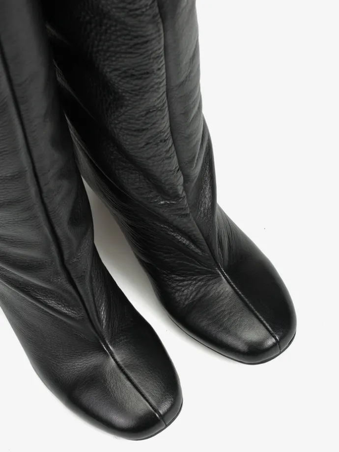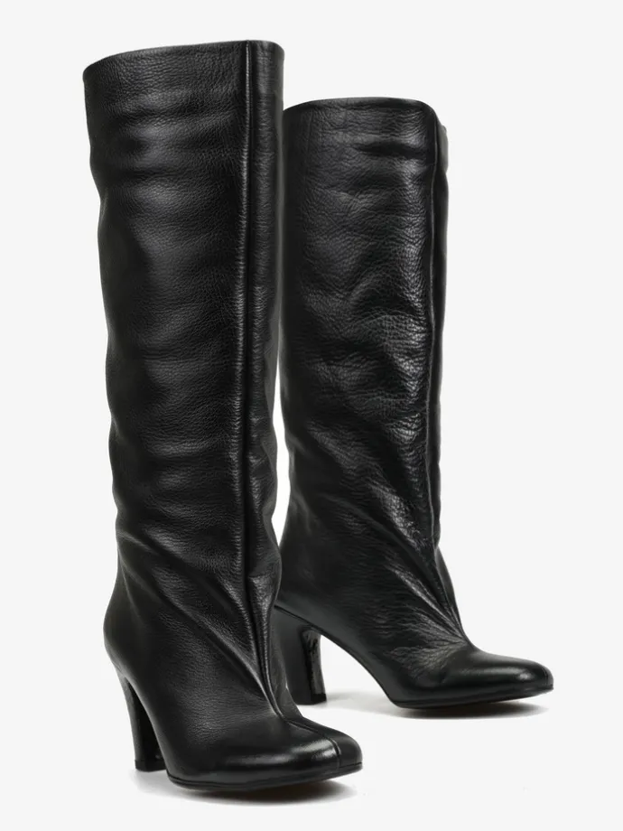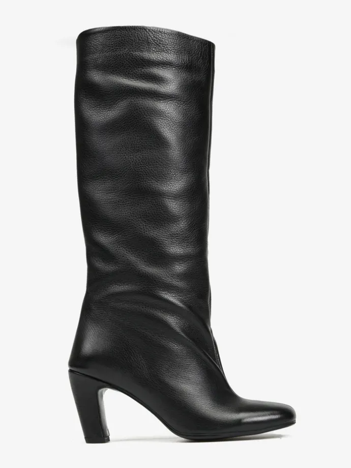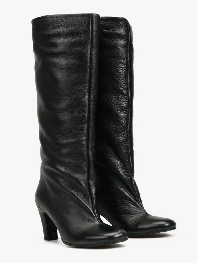 Wsuwane kozaki na obcasie, z marszczoną cholewką.