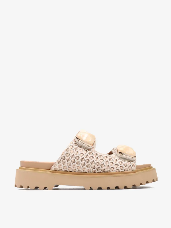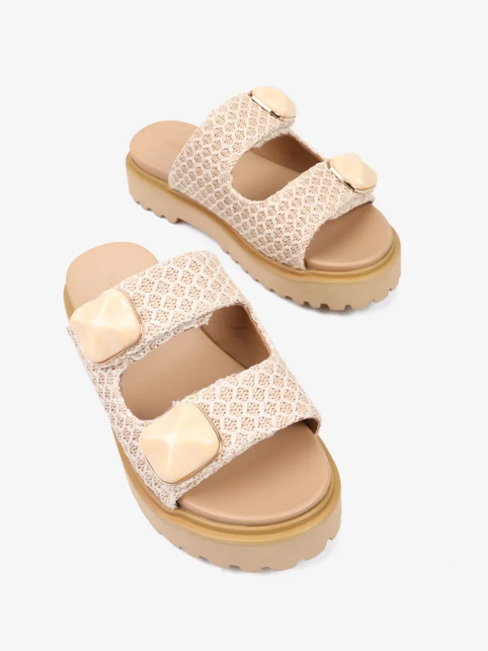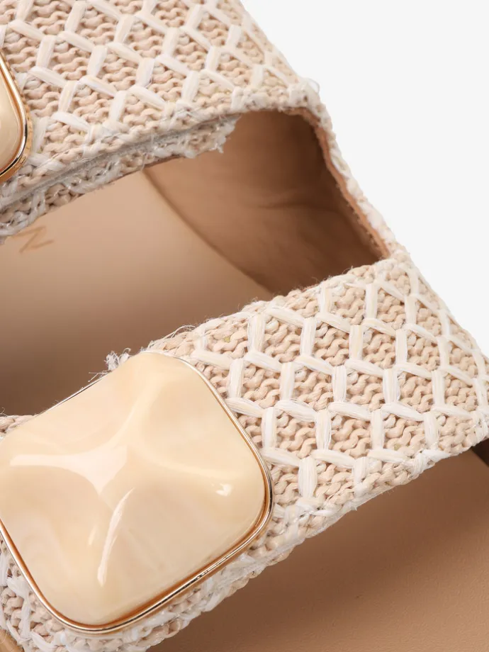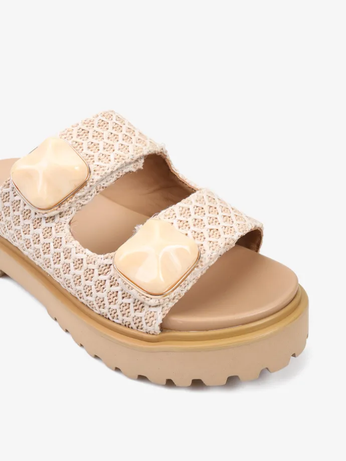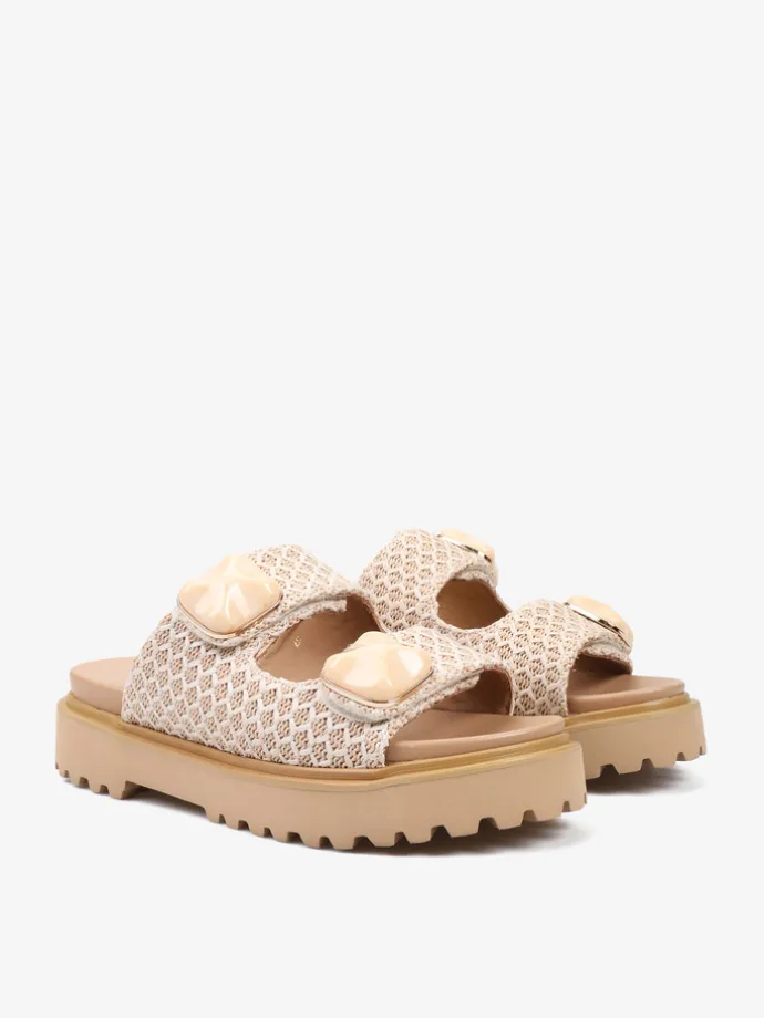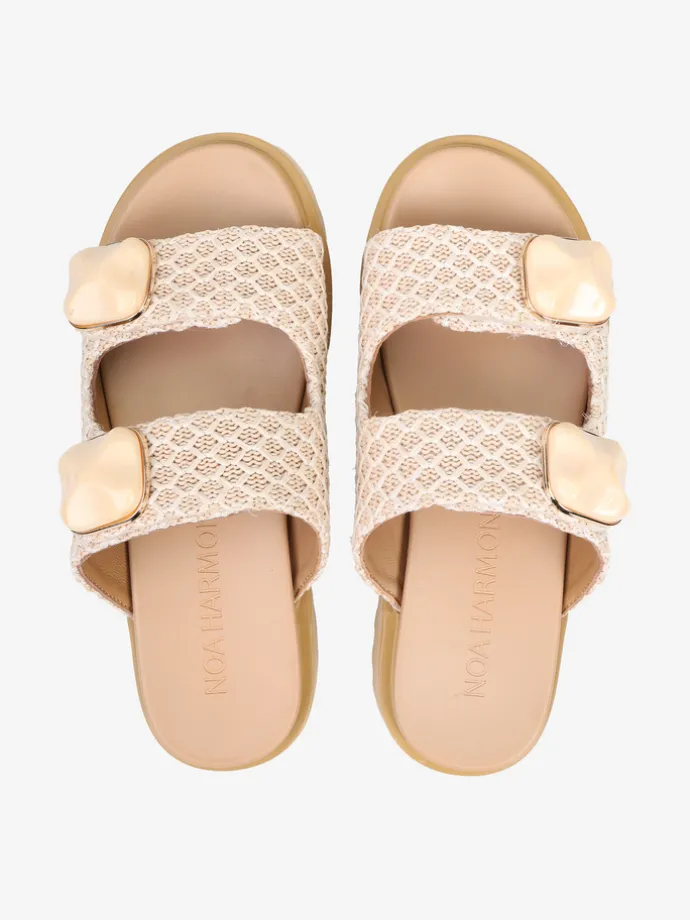 Klapki NOA HARMON z ozdobną aplikacją i plecionymi paskami zapinanymi na rzep. Beżowa wkładka i podeszwa.