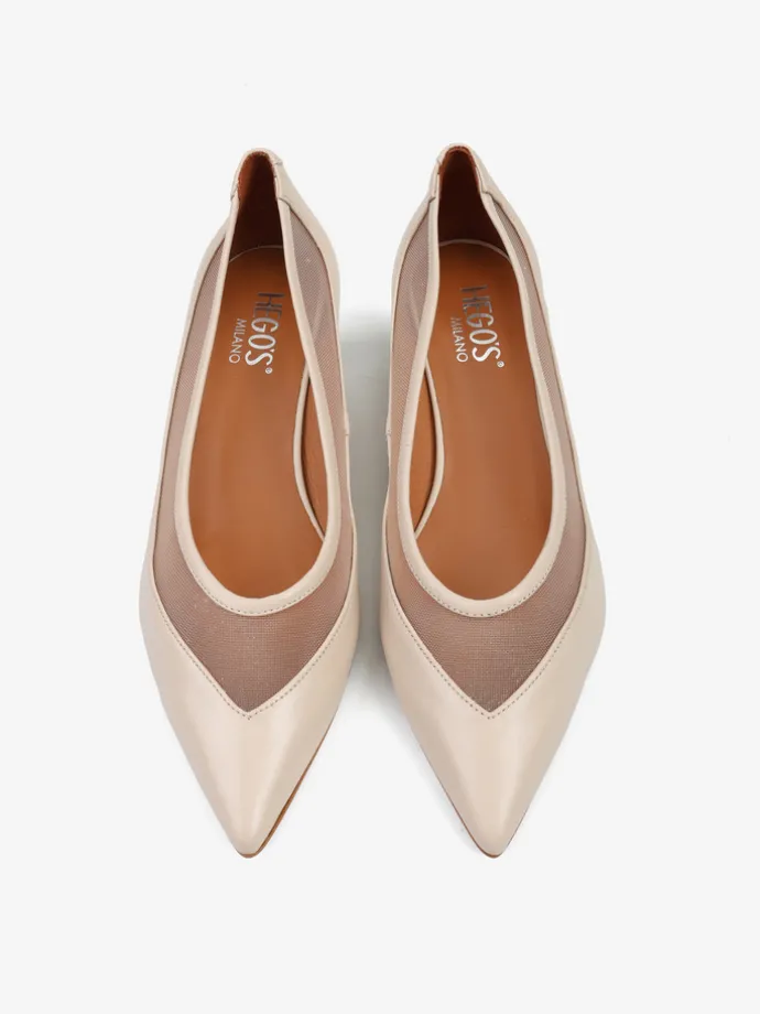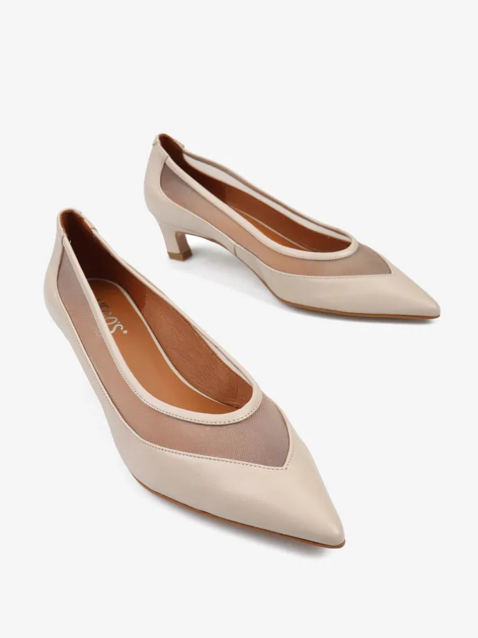 Szpilki z noskiem w szpic z przeszyciem wykonanym z przewiewnej siateczki. Skórzana lamówka.