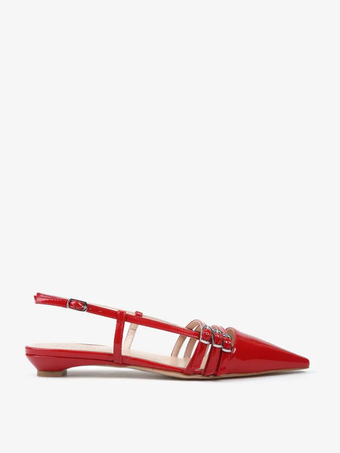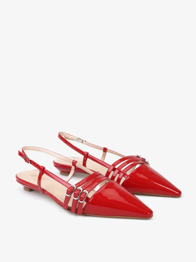 Baleriny z noskiem w szpic i odkrytą piętą z regulowanym paskiem. Ozdobne paseczki.