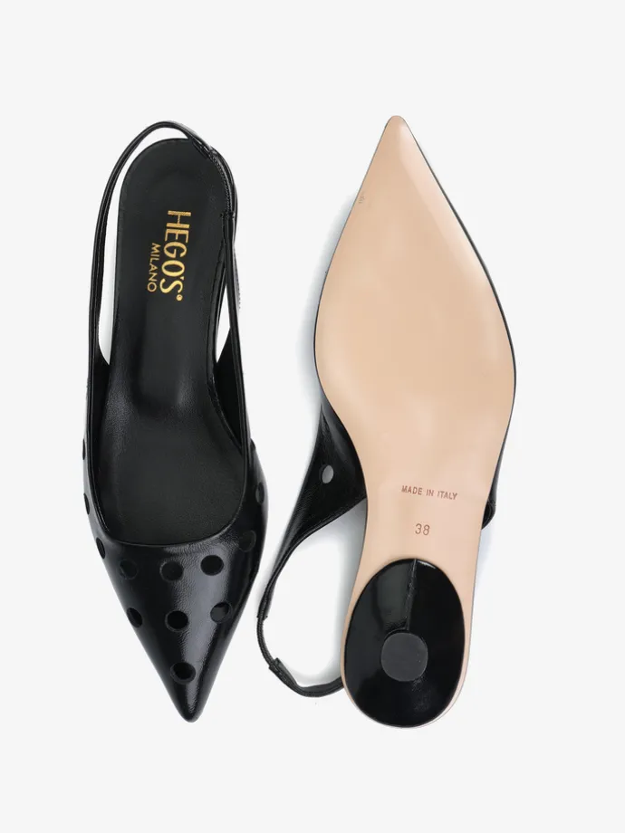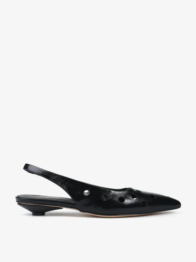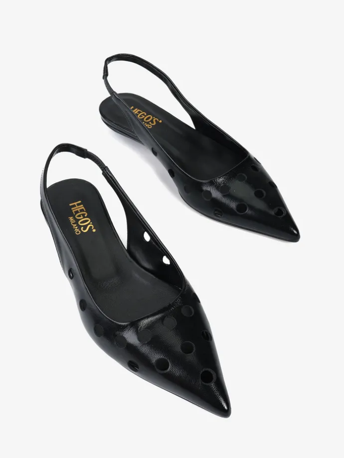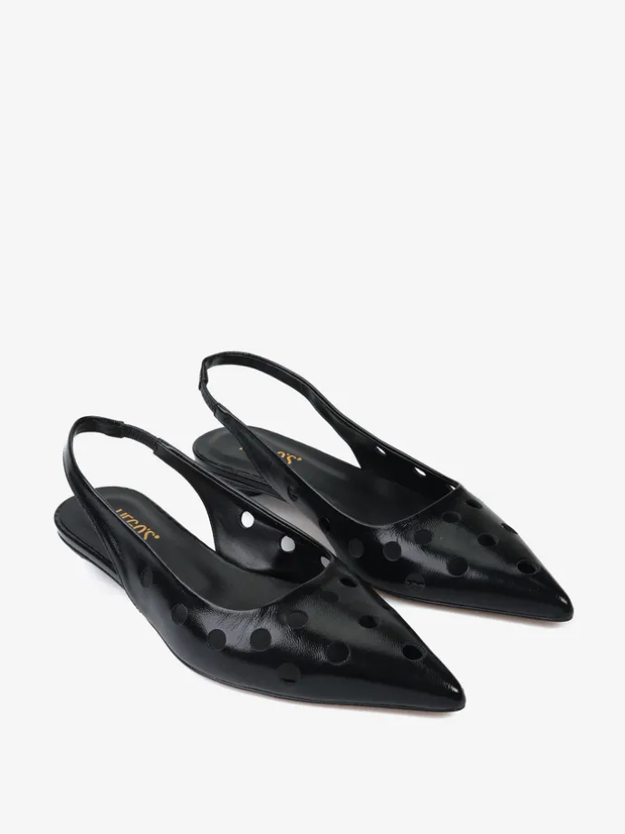 Ażurowe, lakierowane baleriny z noskiem w szpic. Odkryta pięta z paskiem dopasowującym się do stopy.