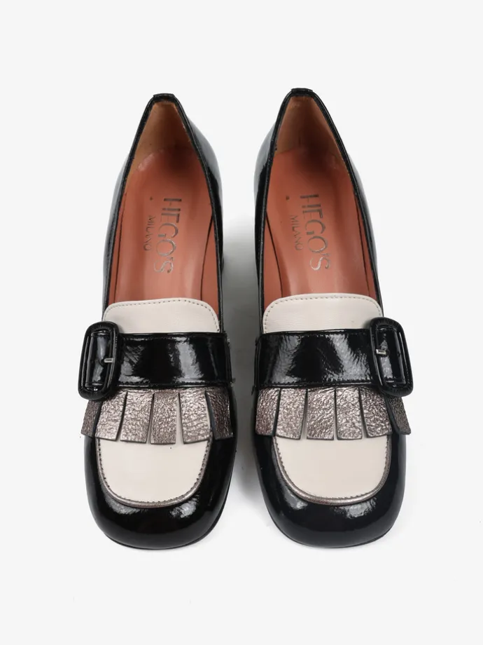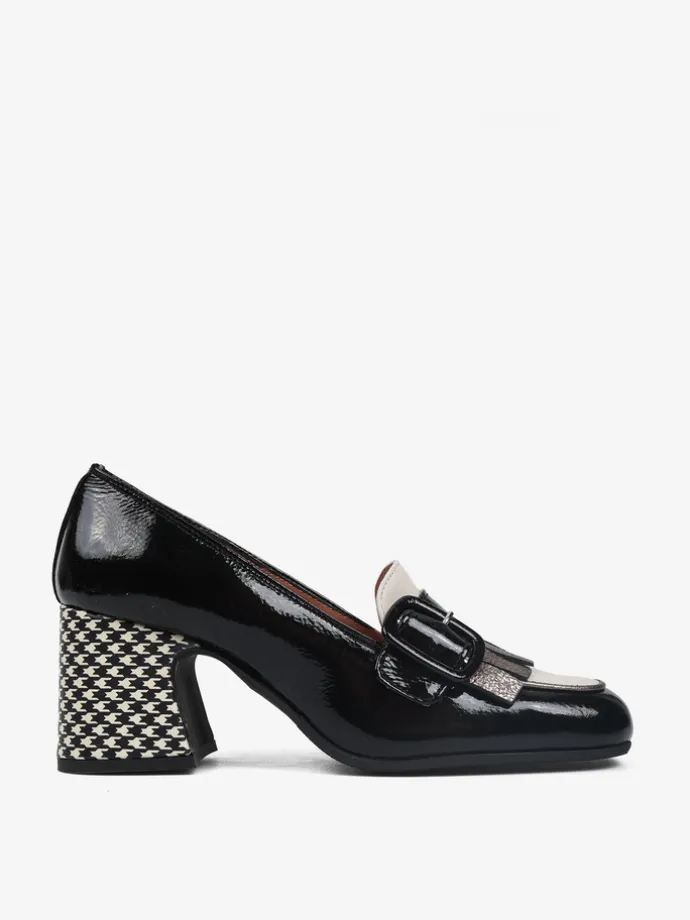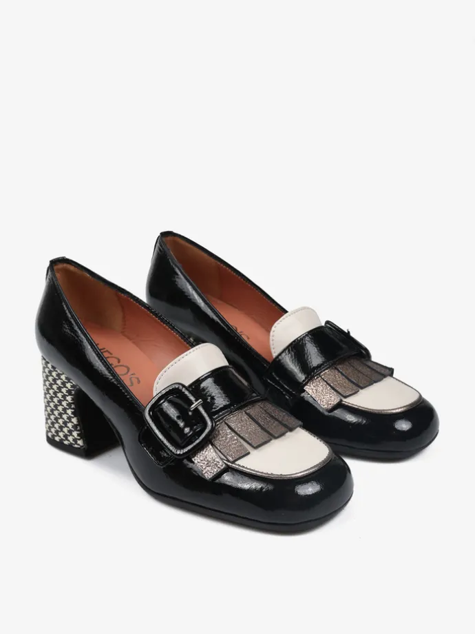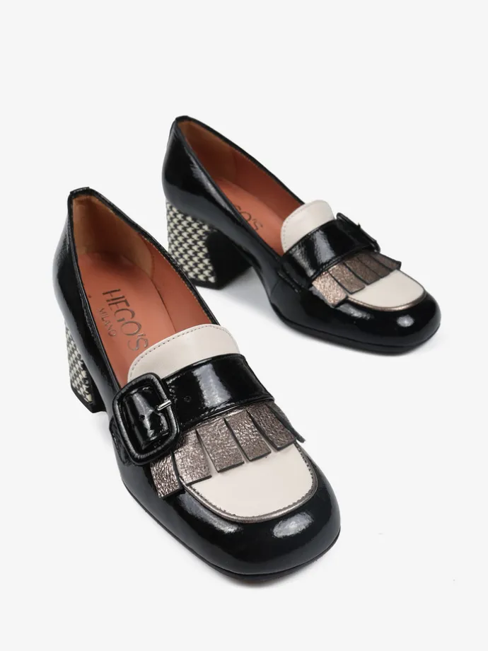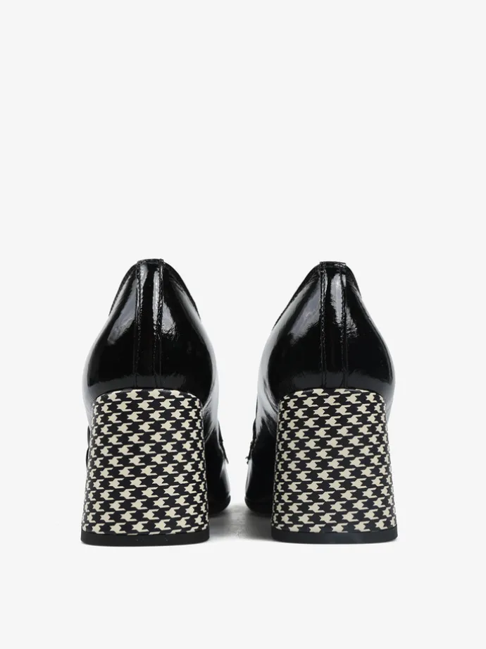 Skórzane czółenka na wzorzystym słupku. Kwadratowe noski z ozdobnym paskiem i metaliczną wstawką.