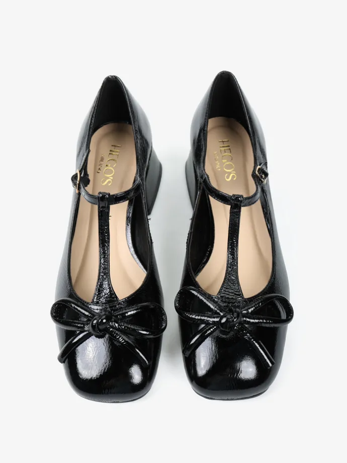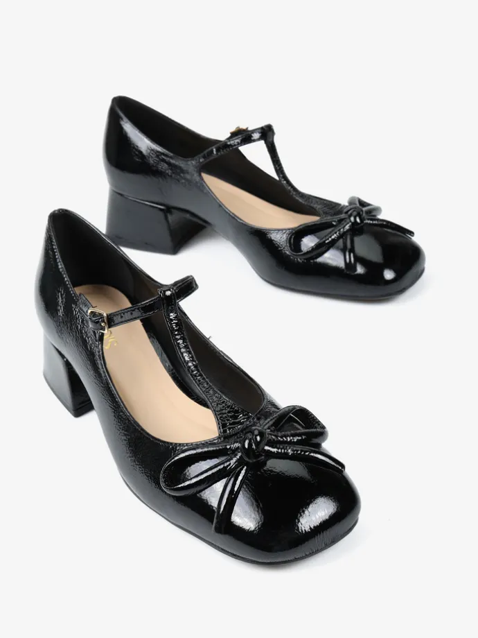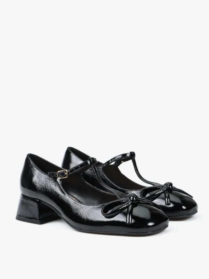 Lakierowane czółenka Mary Jane z paskiem na podbiciu i regulowanym zapięciem. Kwadratowy nosek z ozdobną kokardką.