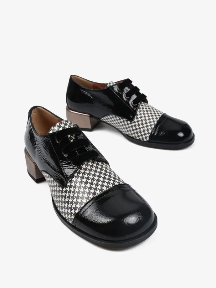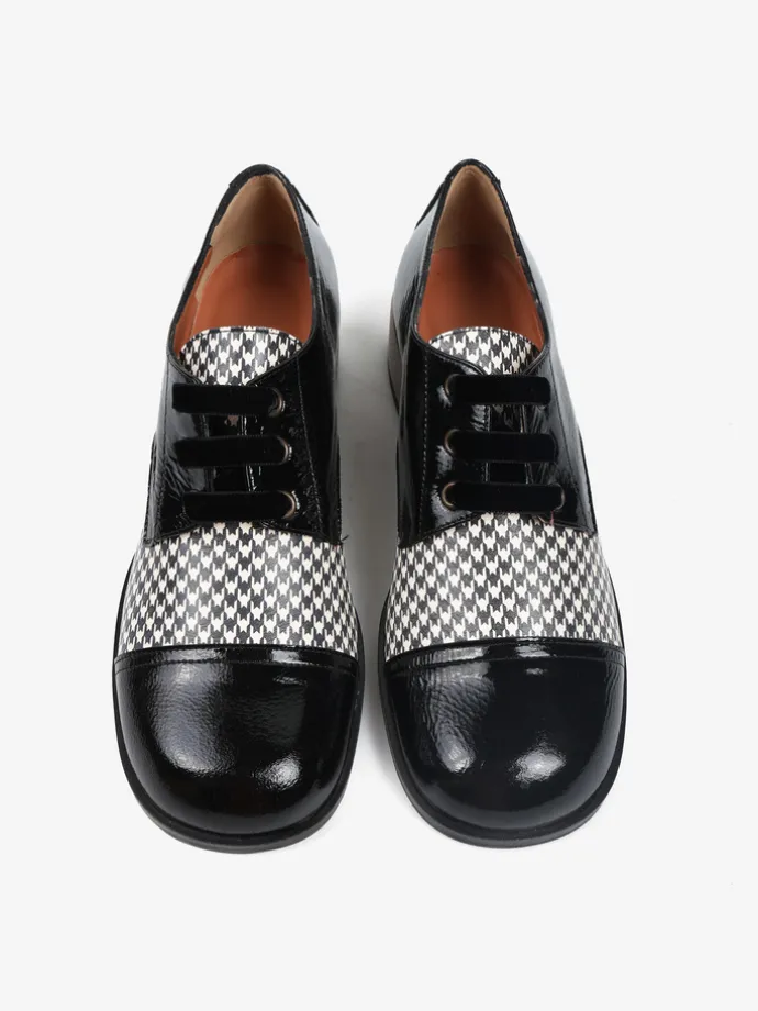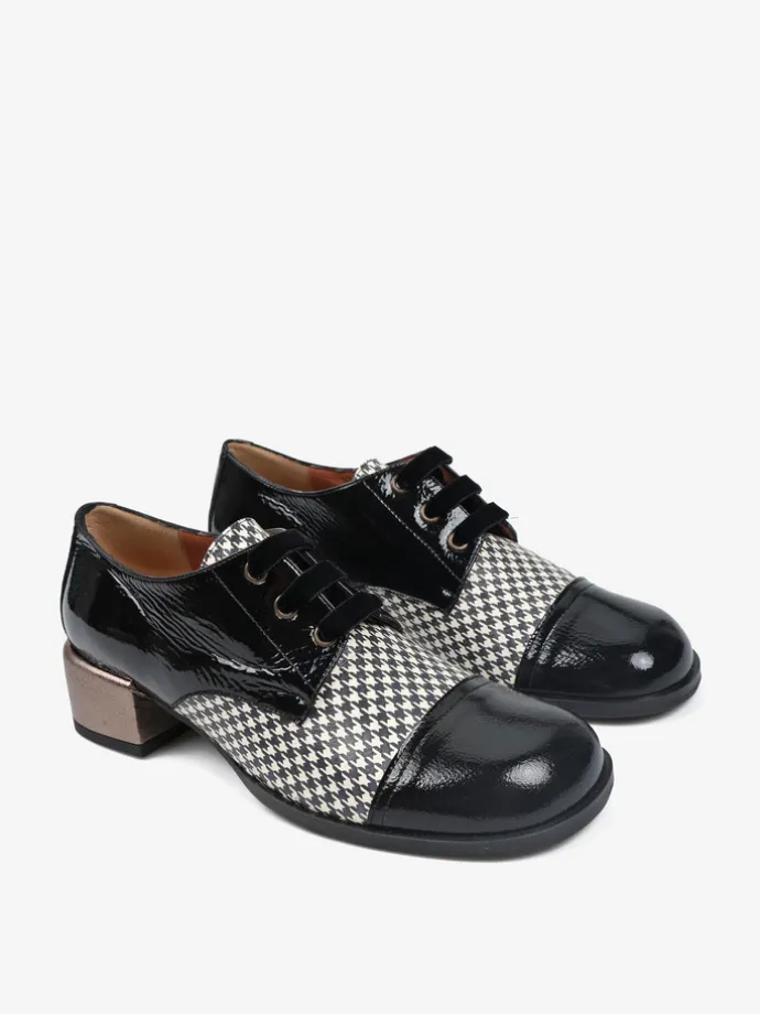 Półbuty na niskim, metalicznym słupku wykonane z lakierowanej skóry ze wzorzystą wstawką. Kwadratowe noski i welurowe sznurowadła.