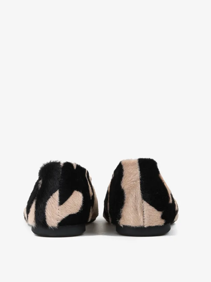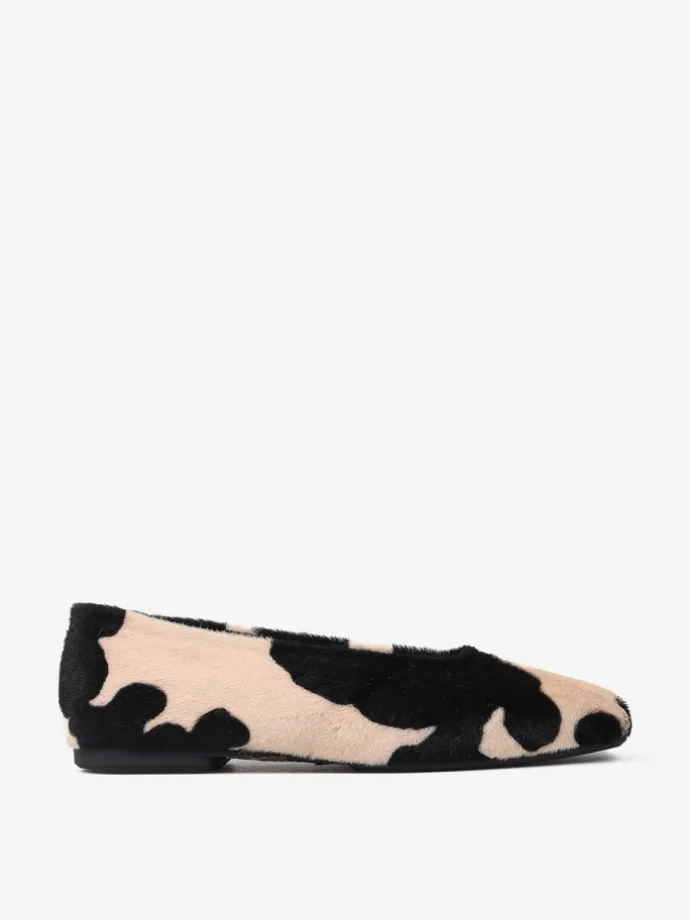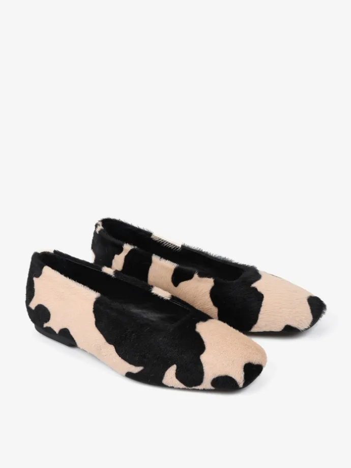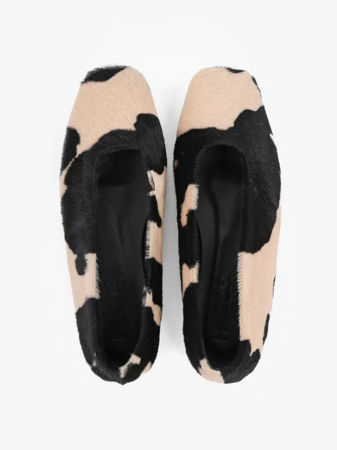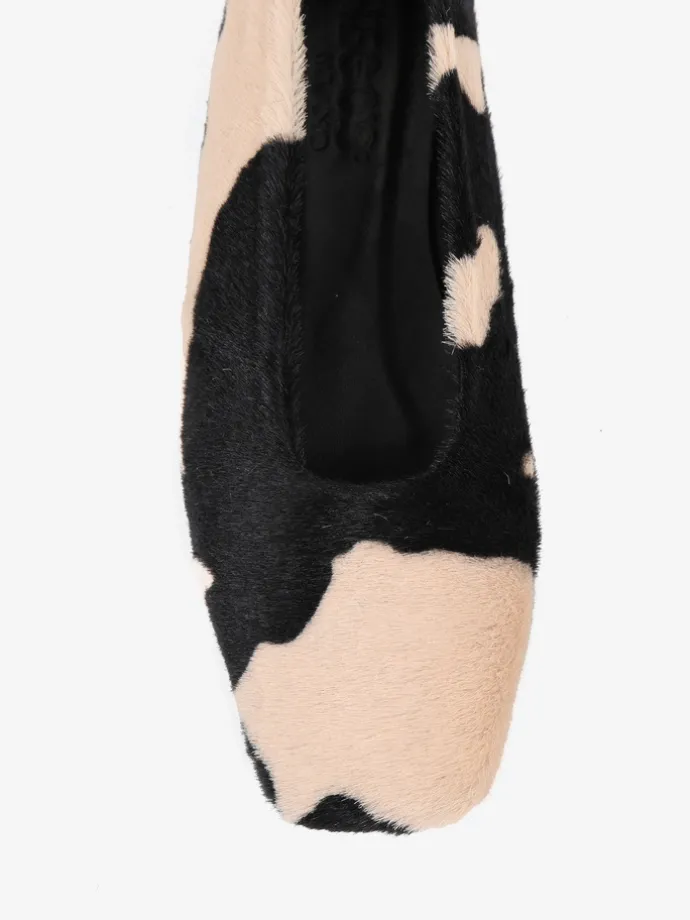 Baleriny COW PRINT, wykonane ze skóry z włosiem w beżowo-czarne łaty. Kwadratowe noski i wycięcie z zabudowanymi brzegami.
