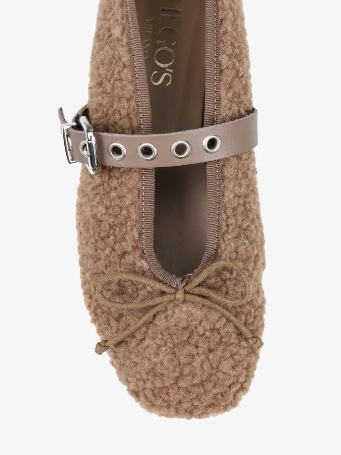Baleriny z tkaniny imitującej futro baranka. Wiązana kokardka i regulowany pasek umożliwiają idealne dopasowanie.