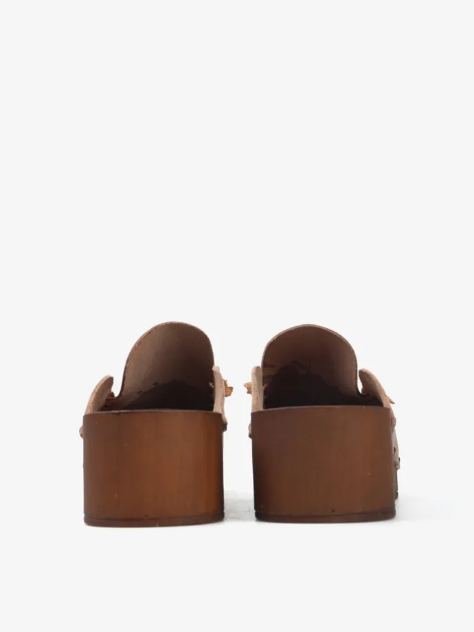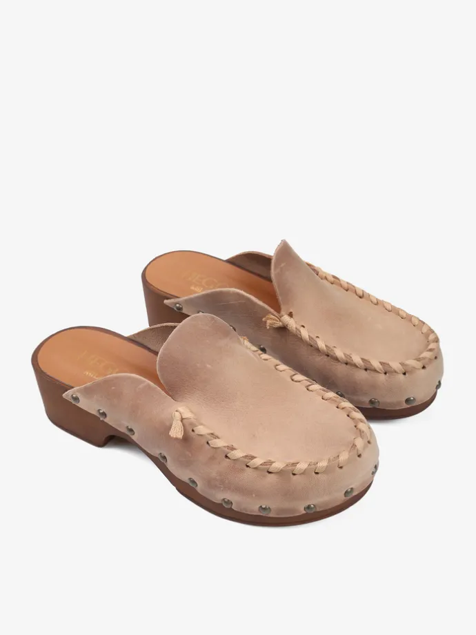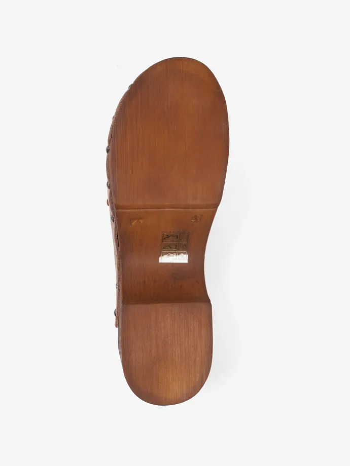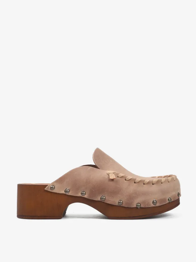 Zamszowe chodaki z ćwiekami i ozdobnym, widocznym szwem.