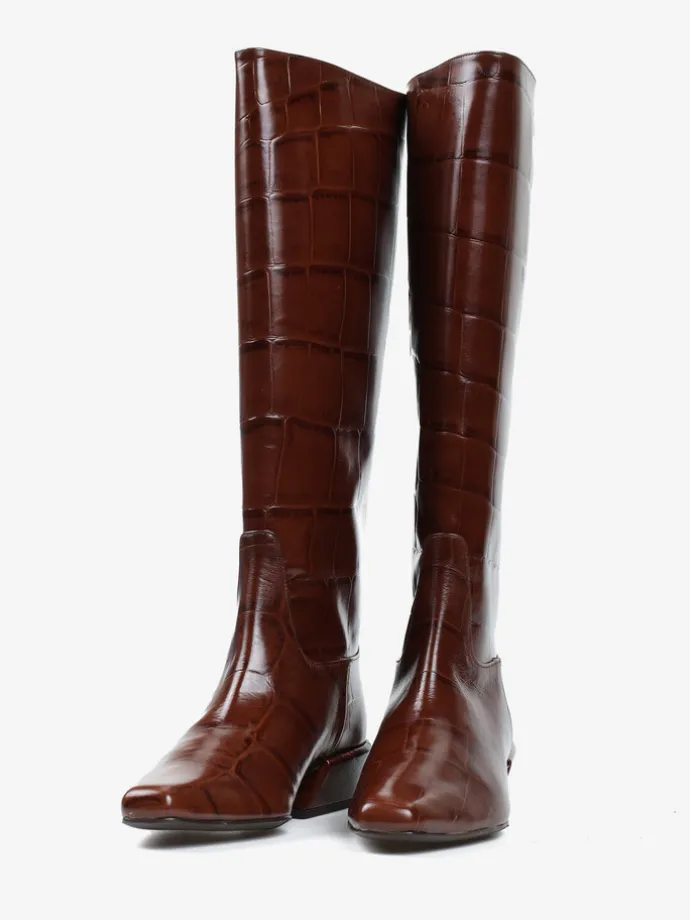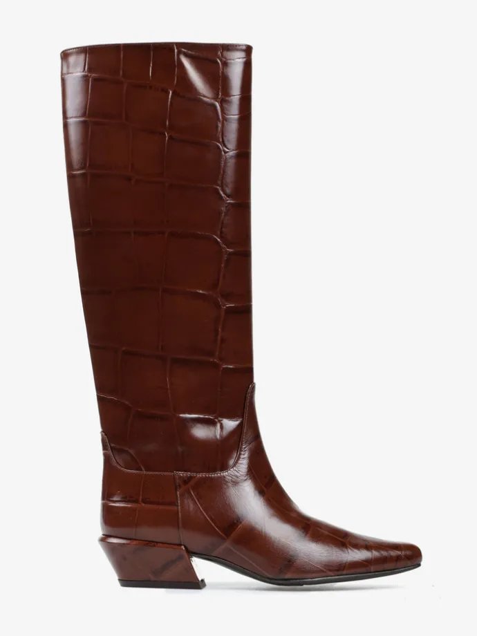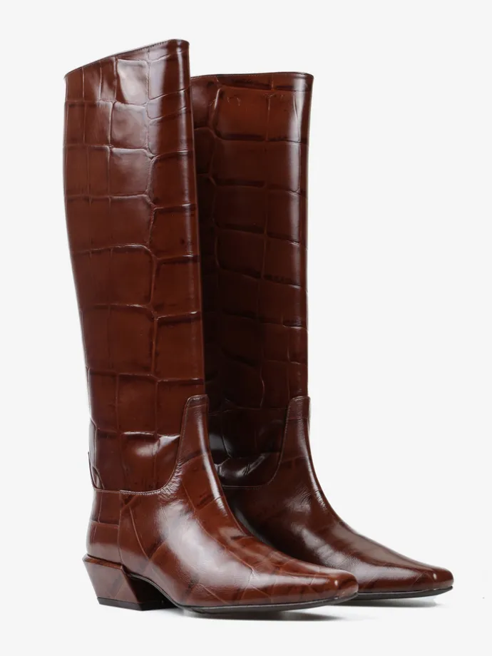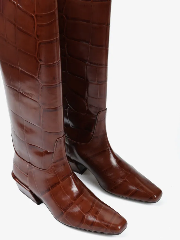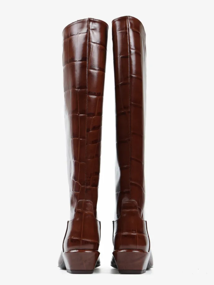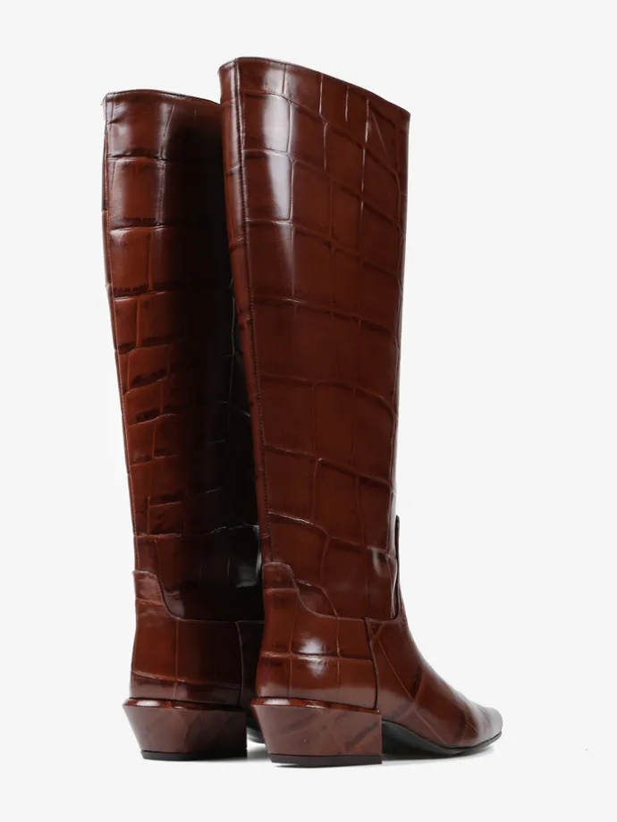 Wsuwane kozaki w kowbojskim stylu, wykonane ze skóry wysoko polerowanej tłoczonej w krokodyli wzór.