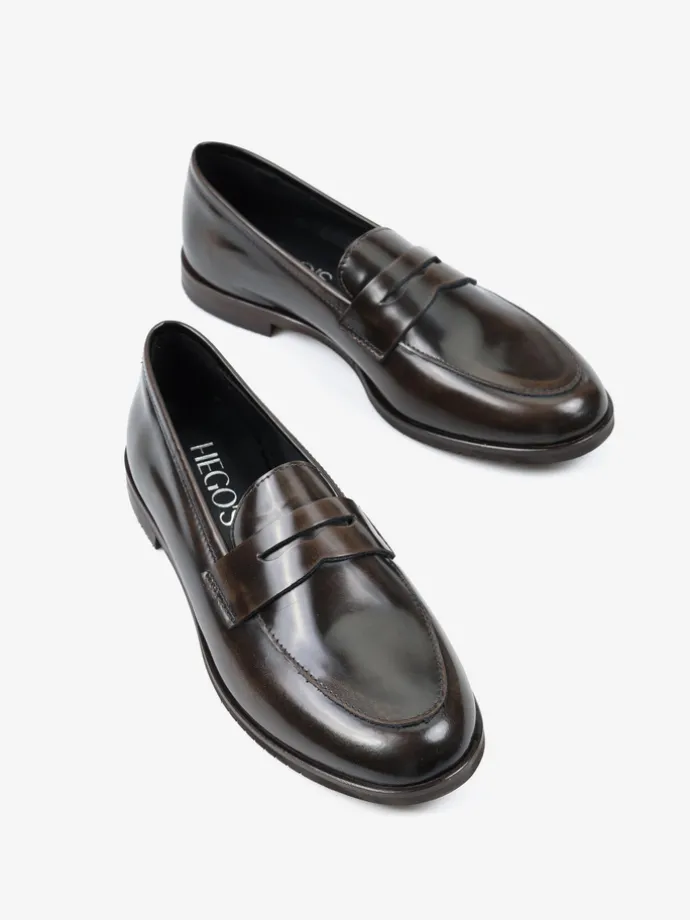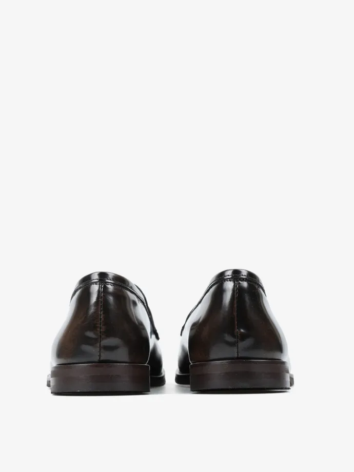 Klasyczne mokasyny z patką, wykonane z wysokopolerowanej skóry z delikatnym efektem sprania.
