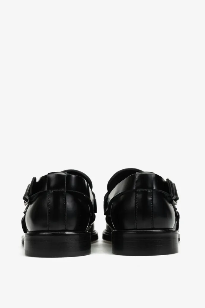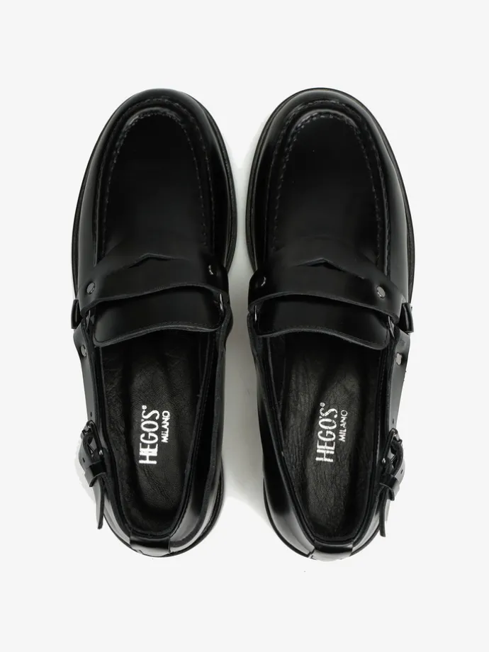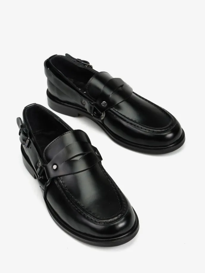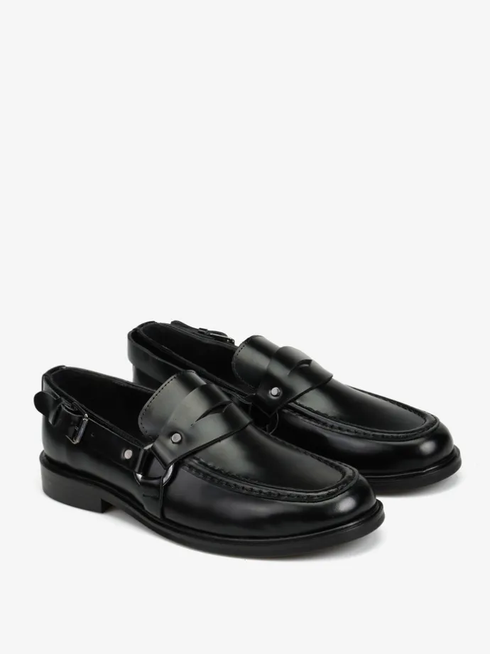 Mokasyny wykonane ze skóry wysoko polerowanej. Ozdobna patka i pasek z wędzidłem z boku cholewki.