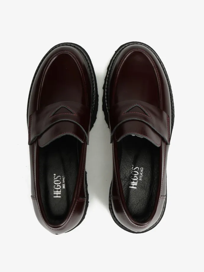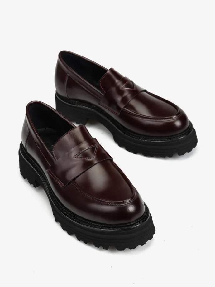 Mokasyny na platformie wykonane ze skóry wysoko polerowanej. Ozdobna patka z trójkątnym wycięciem.