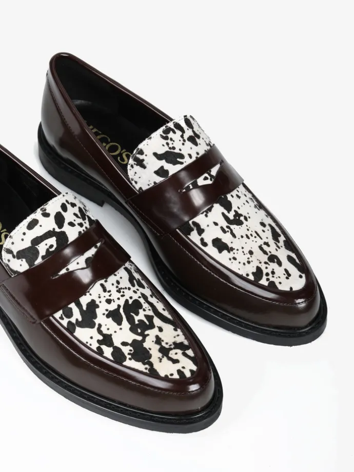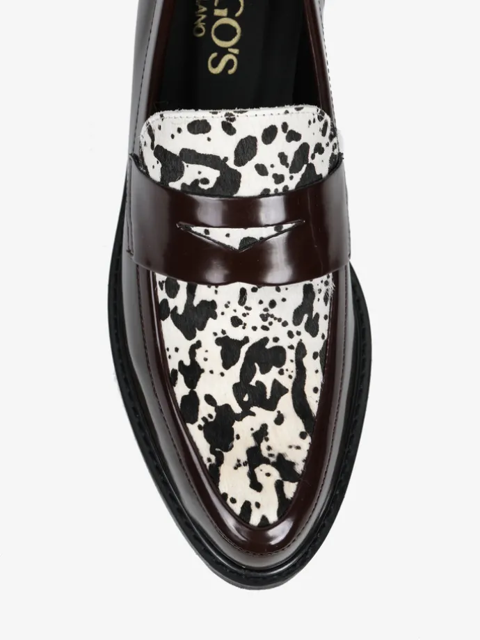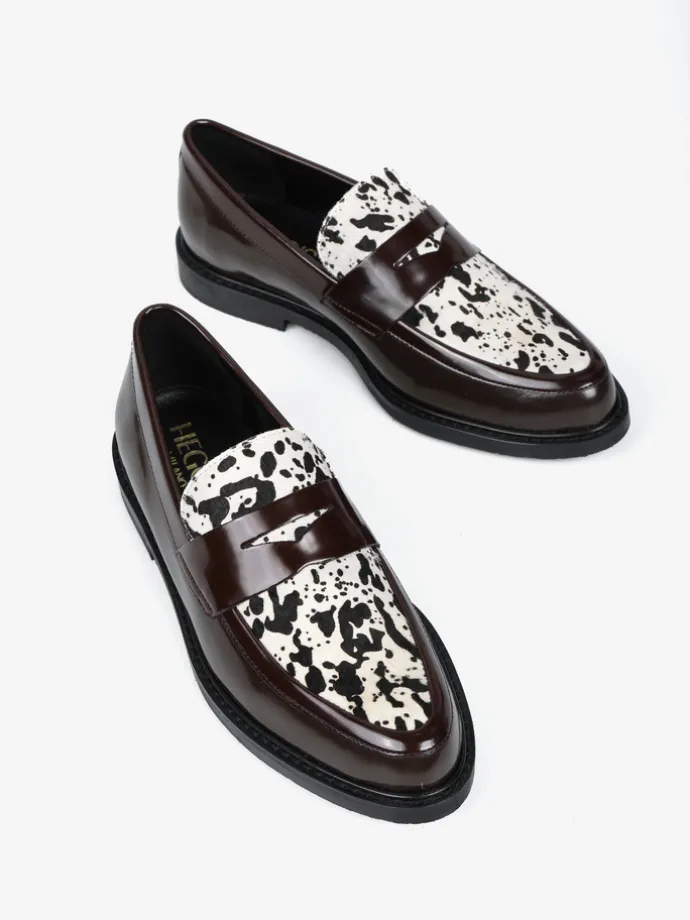 Mokasyny z patką wykonane z wysokopolerowanej, brązowej skóry. Ozdobna wstawka ze skóry z włosiem.