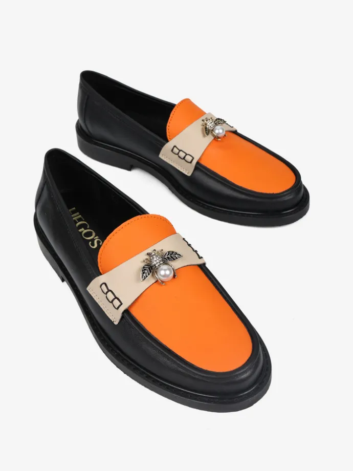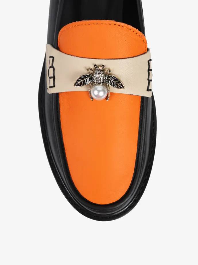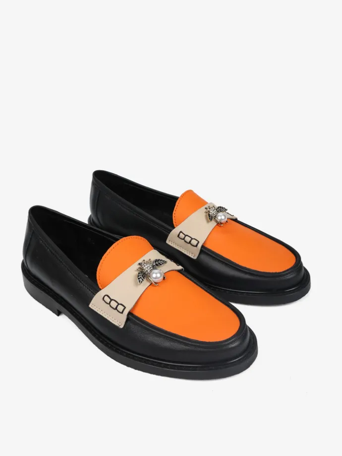Mokasyny z kontrastującym, pomarańczowym językiem wykonane z miękkiej i delikatnej skóry. Beżowa patka z biżuteryjną aplikacją.