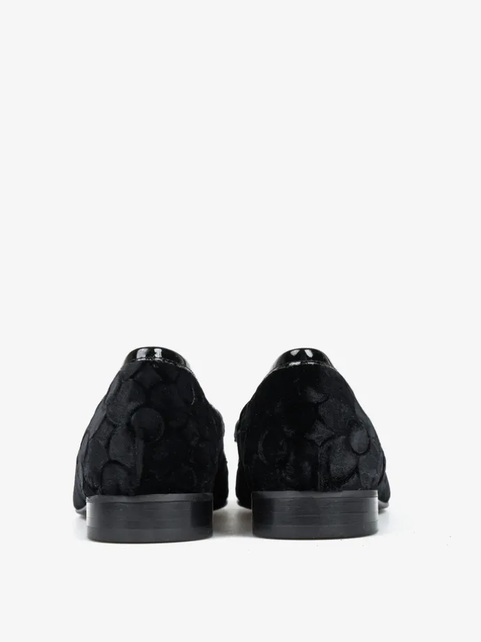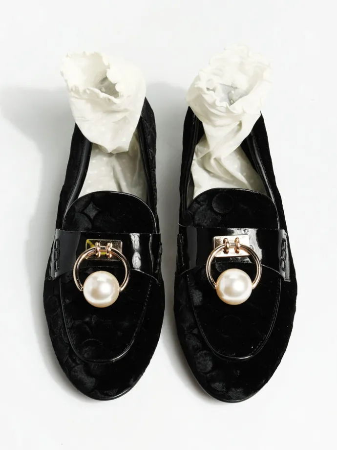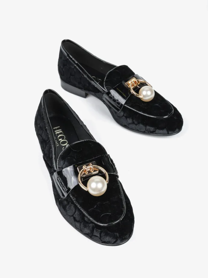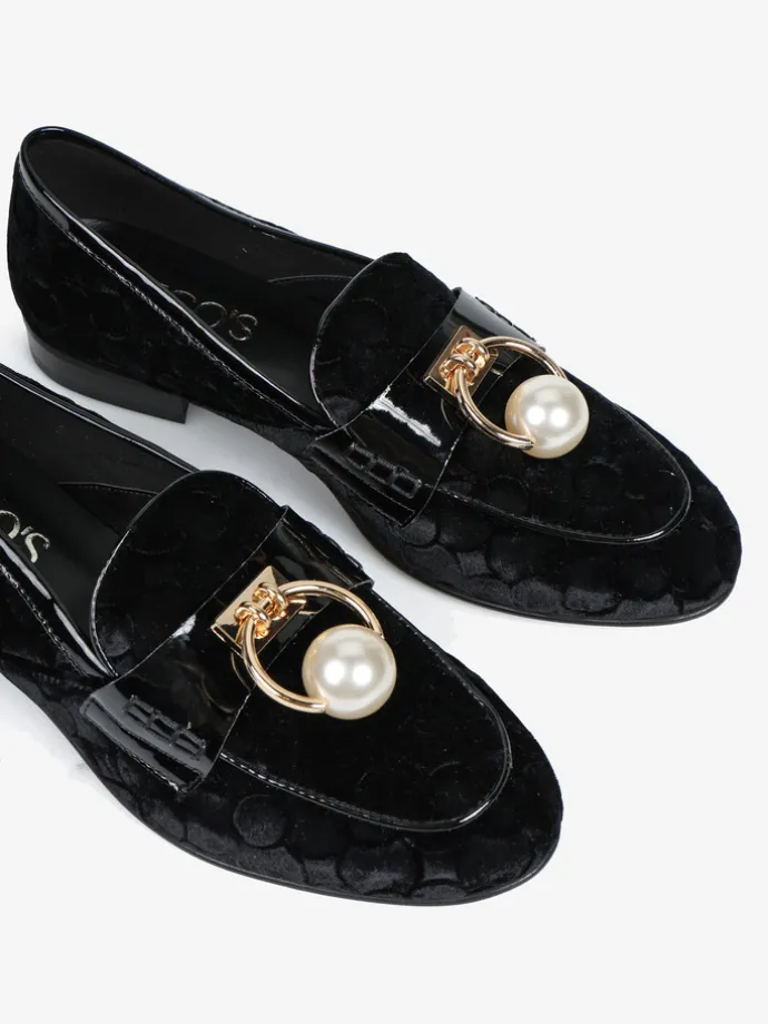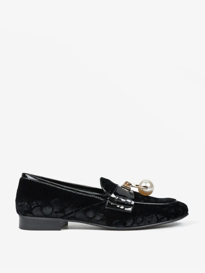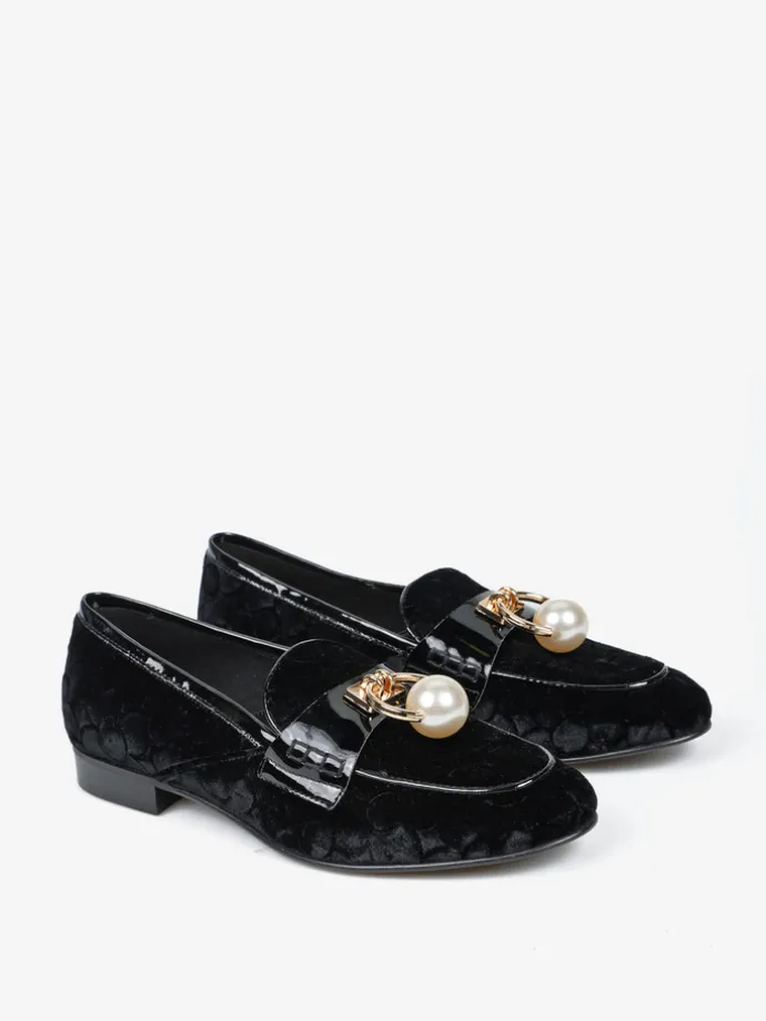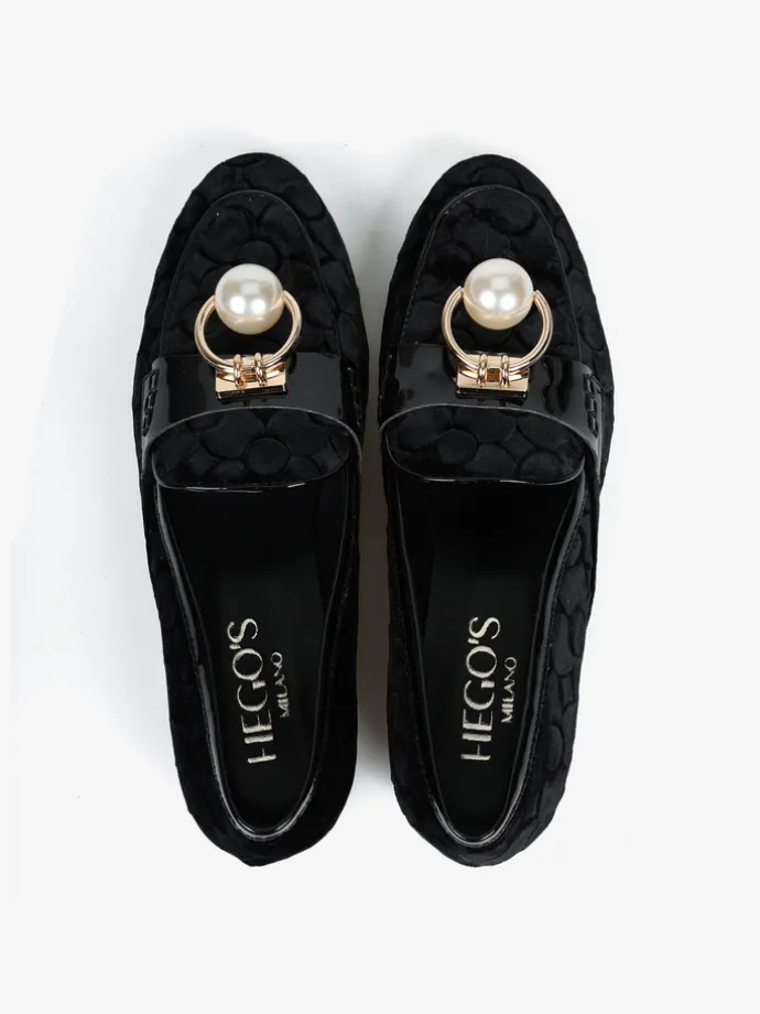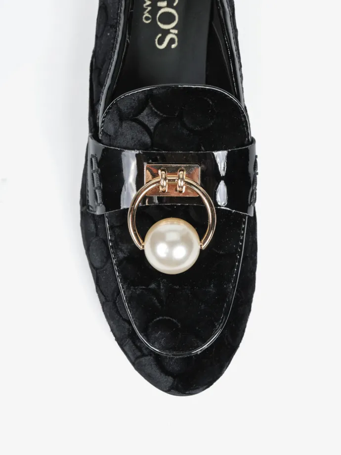 Mokasyny z tłoczonego weluru z wysokopolerowaną patką. Biżuteryjna aplikacja z perłą.