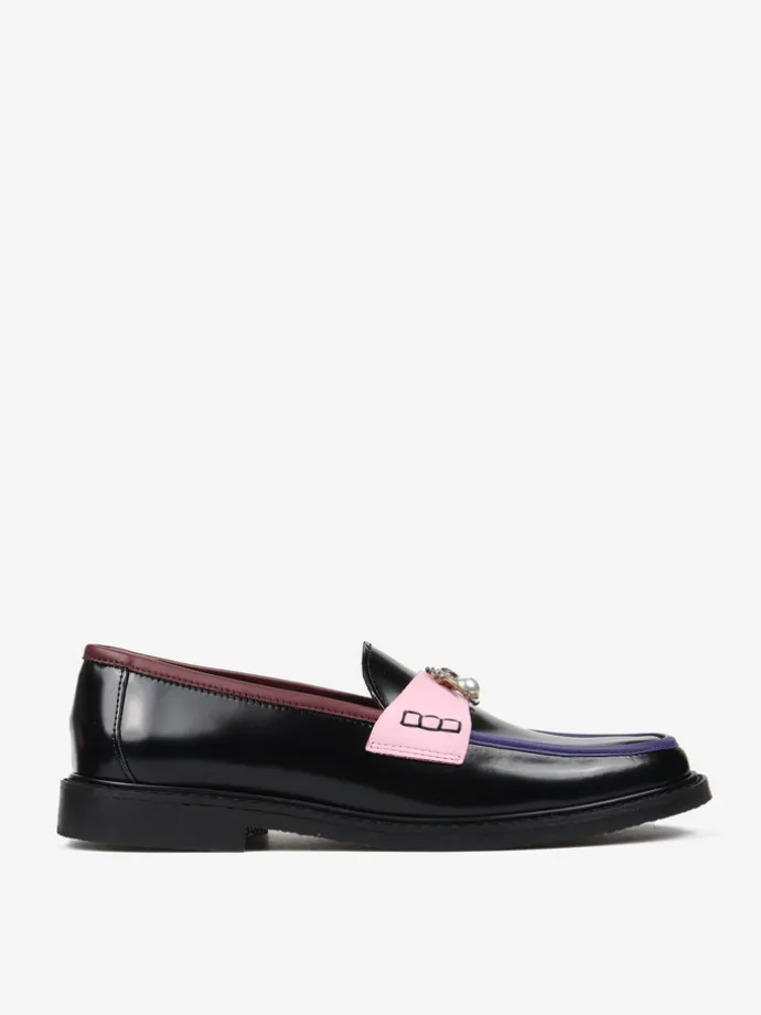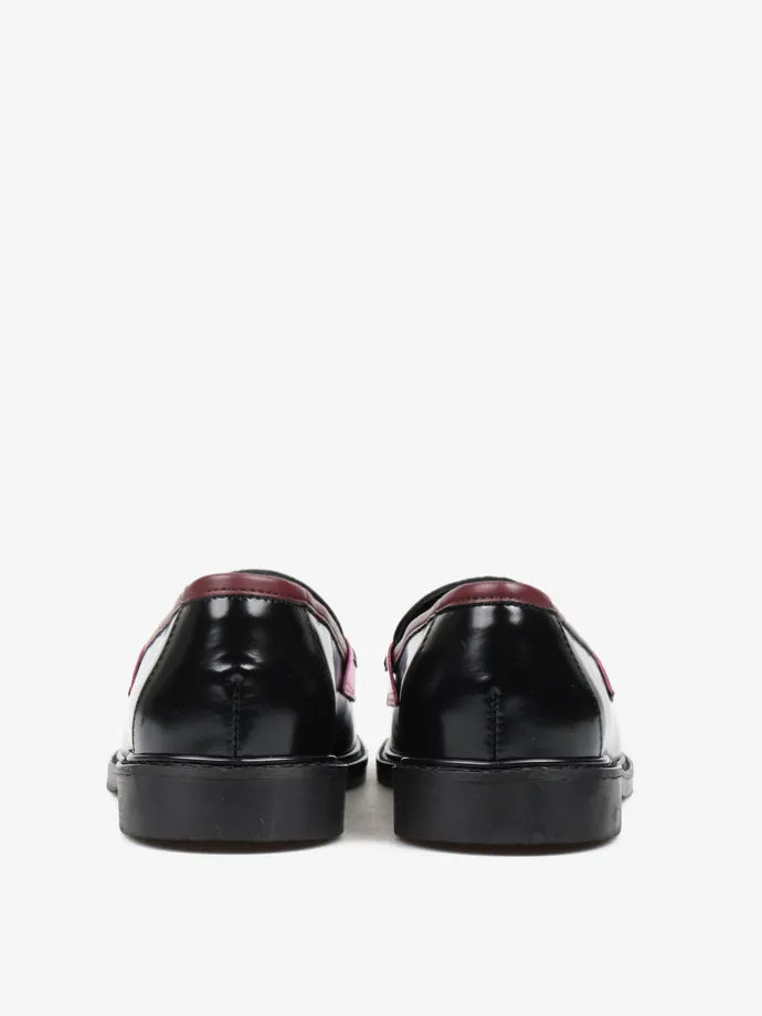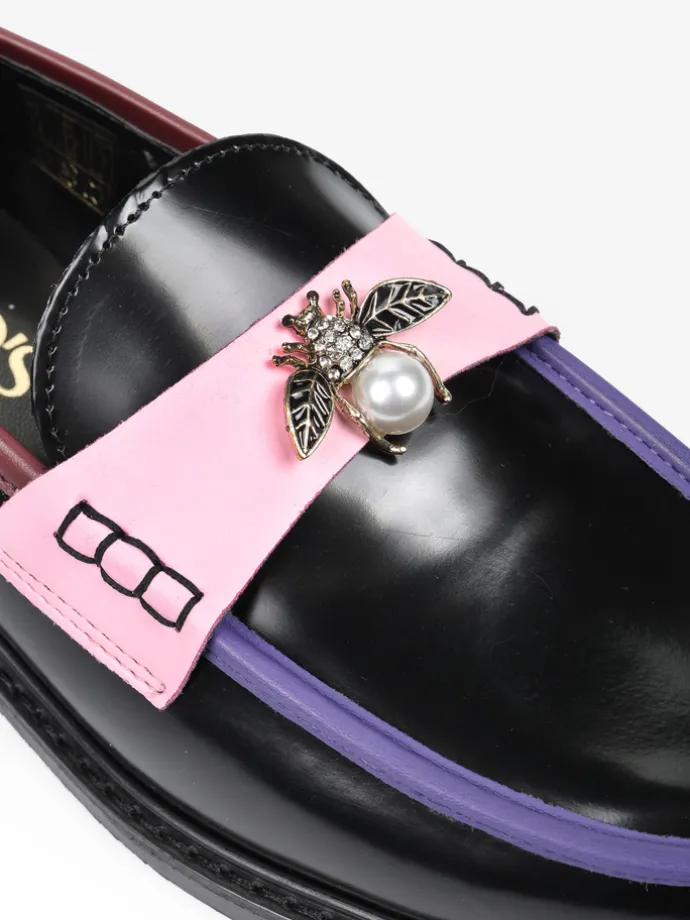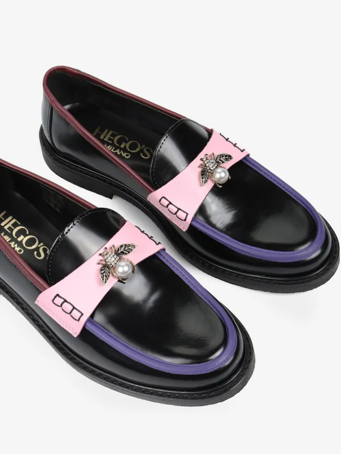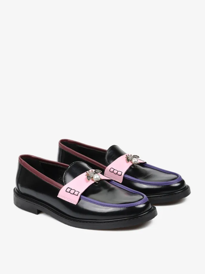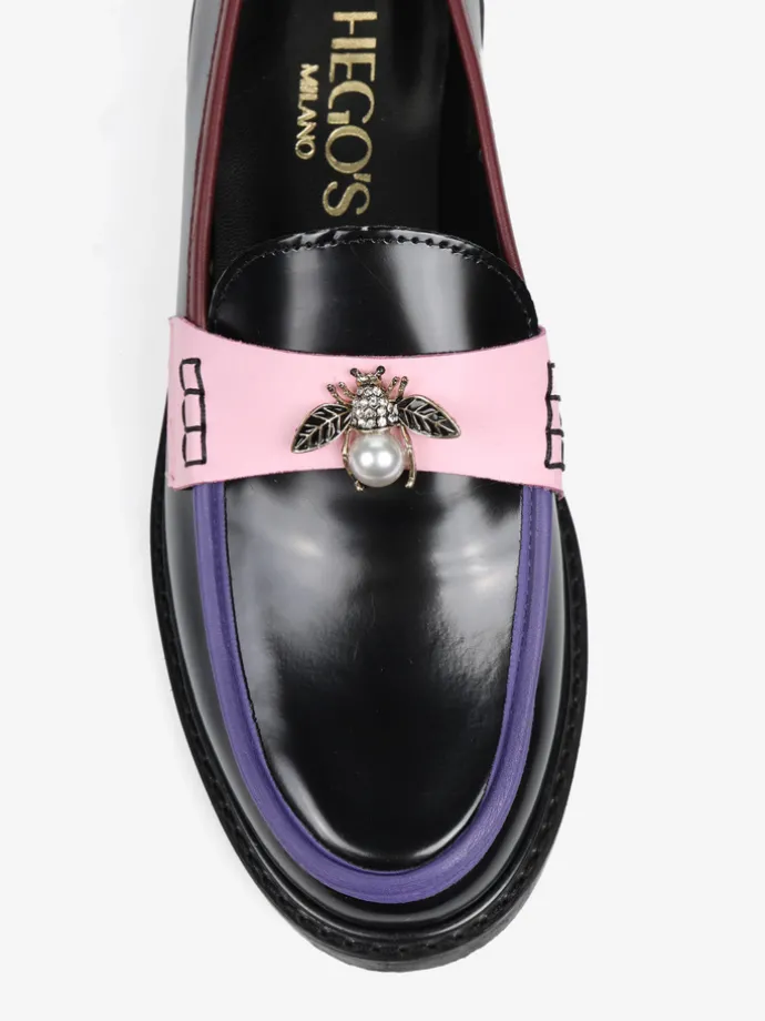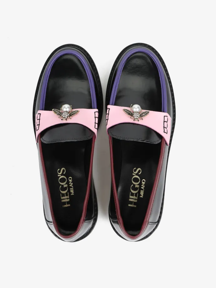 Mokasyny na płaskim obcasie to must have kobiecej garderoby. Wykonane są z włoskiej, naturalnej skóry. Fason w stylu lordsy posiada wysoki język, charakterystyczny dla tego modelu. Modne połączenie kolorystyczne i broszka pszczoły to detale wyróżniające ten model.