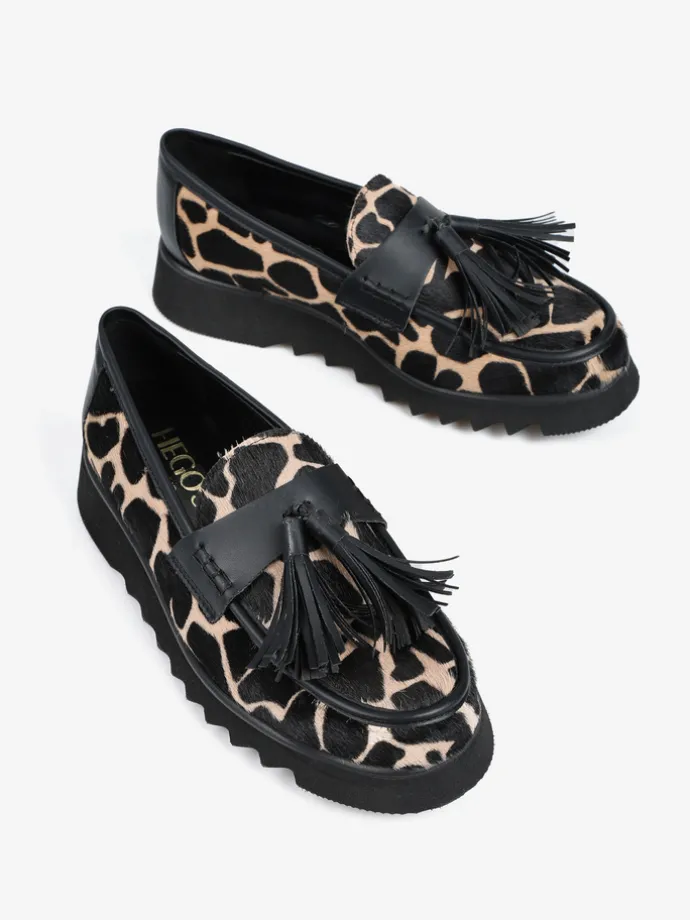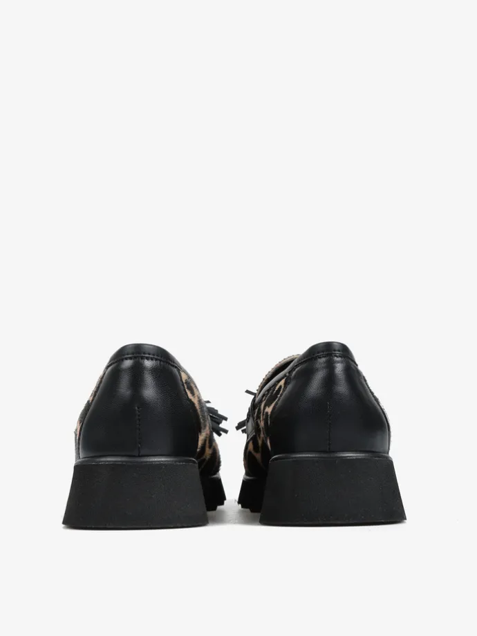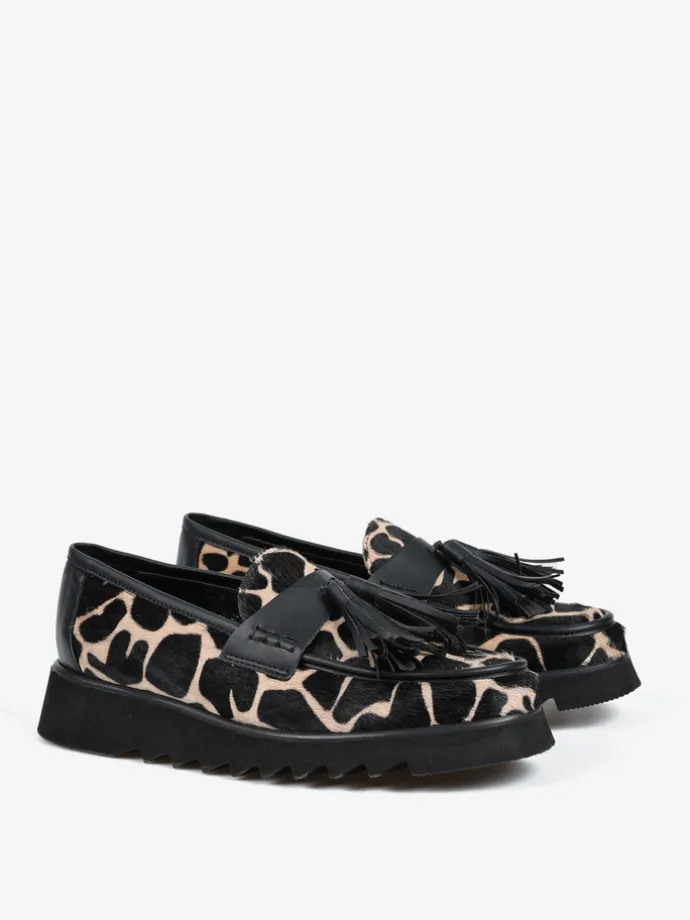 Mokasyny na efektownej podeszwie wykonane z naturalnej skóry z włosiem w zwierzęcy wzór. Ozdobna patka z frędzlami.