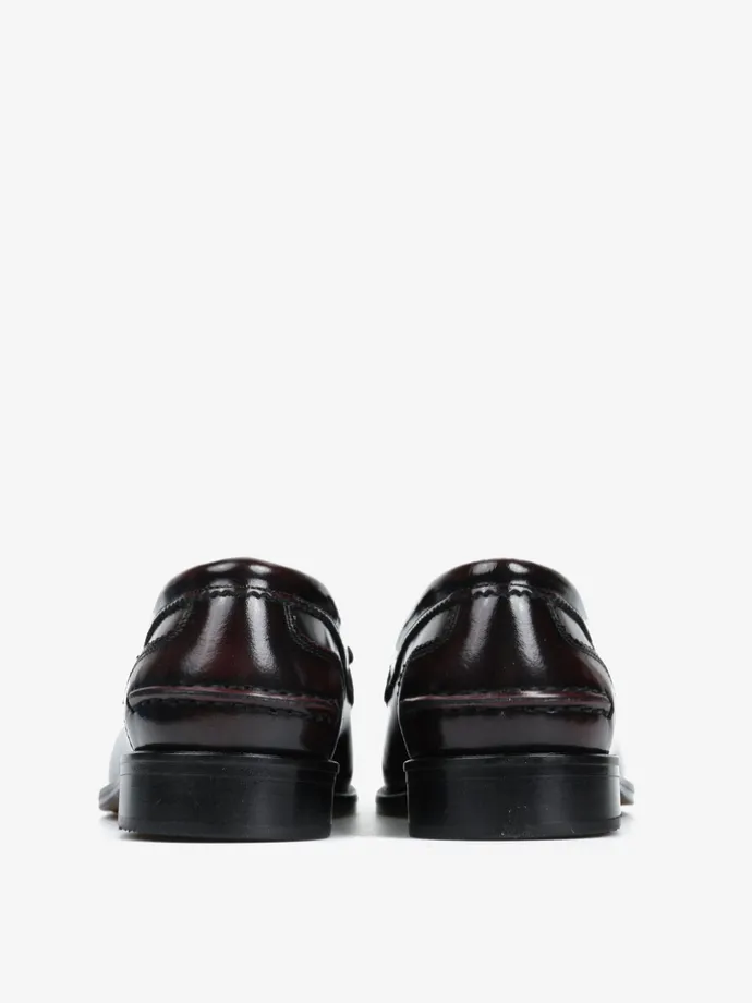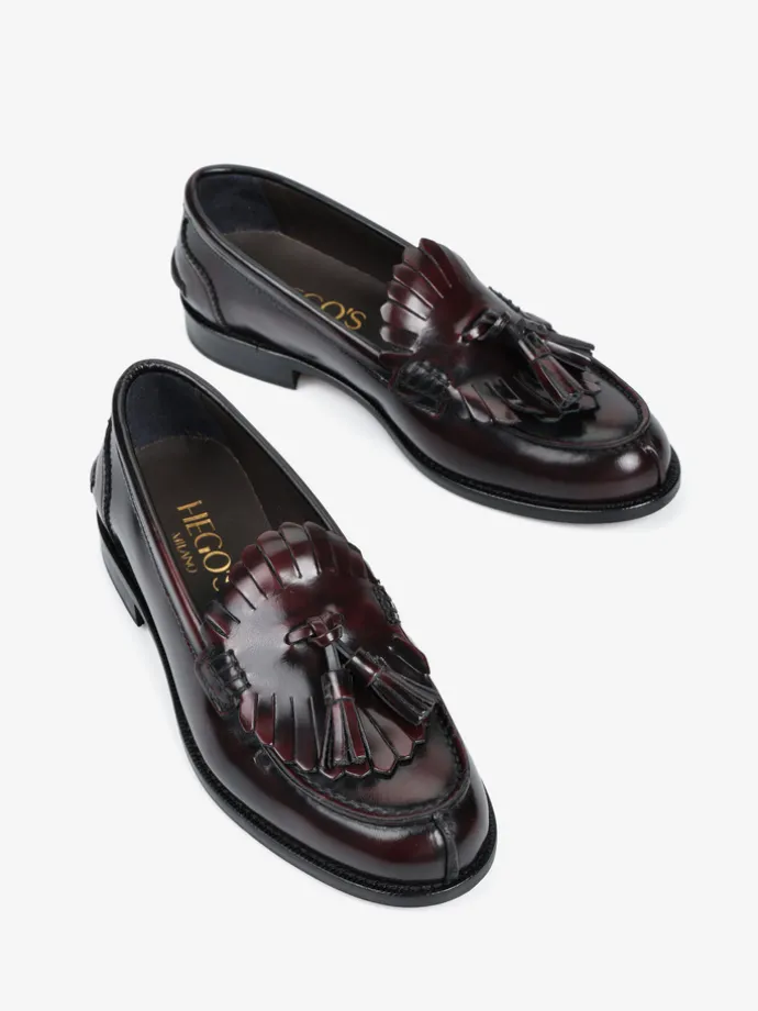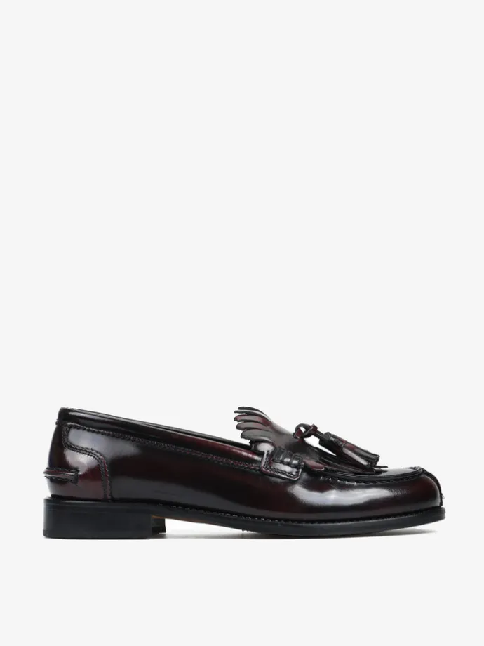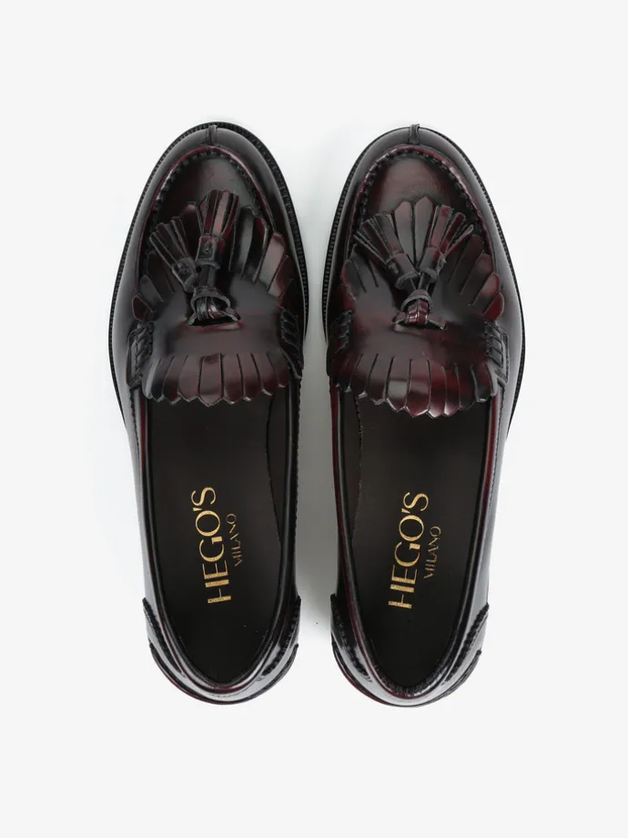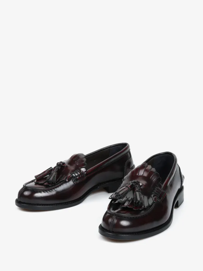 Bordowe mokasyny wykonane ze skóry wysoko polerowanej, z wycięciami na języku i ozdobnymi frędzlami.