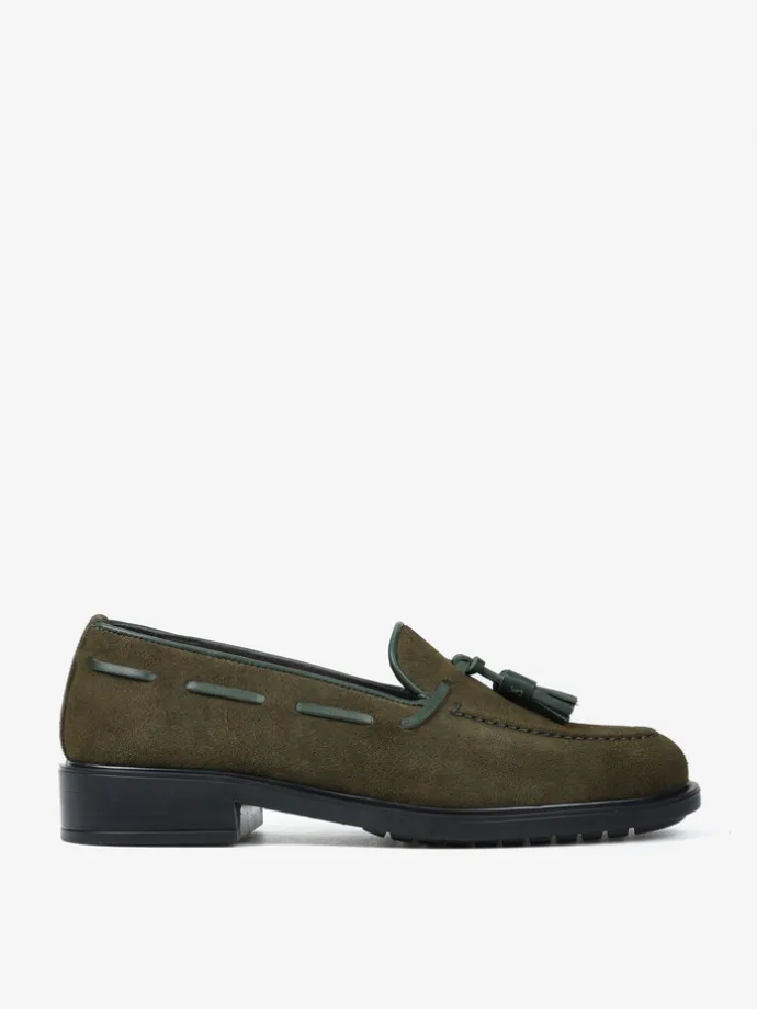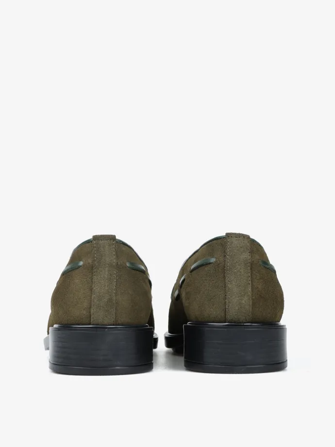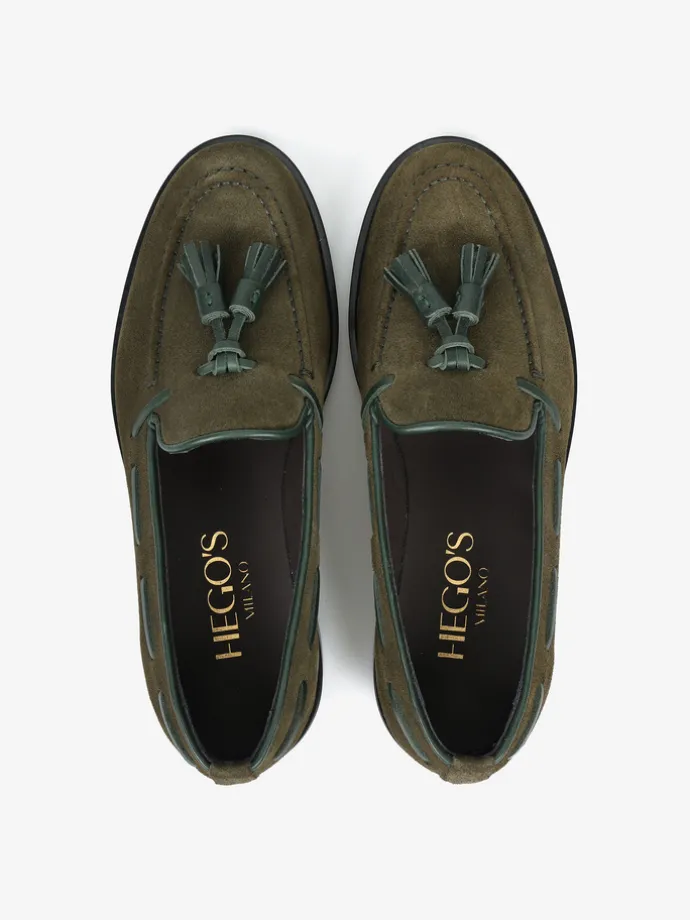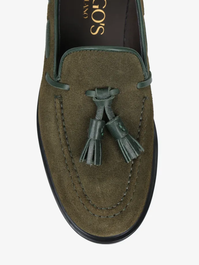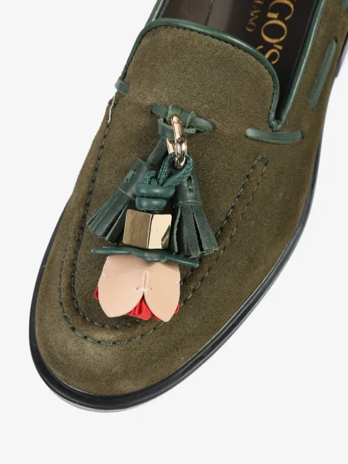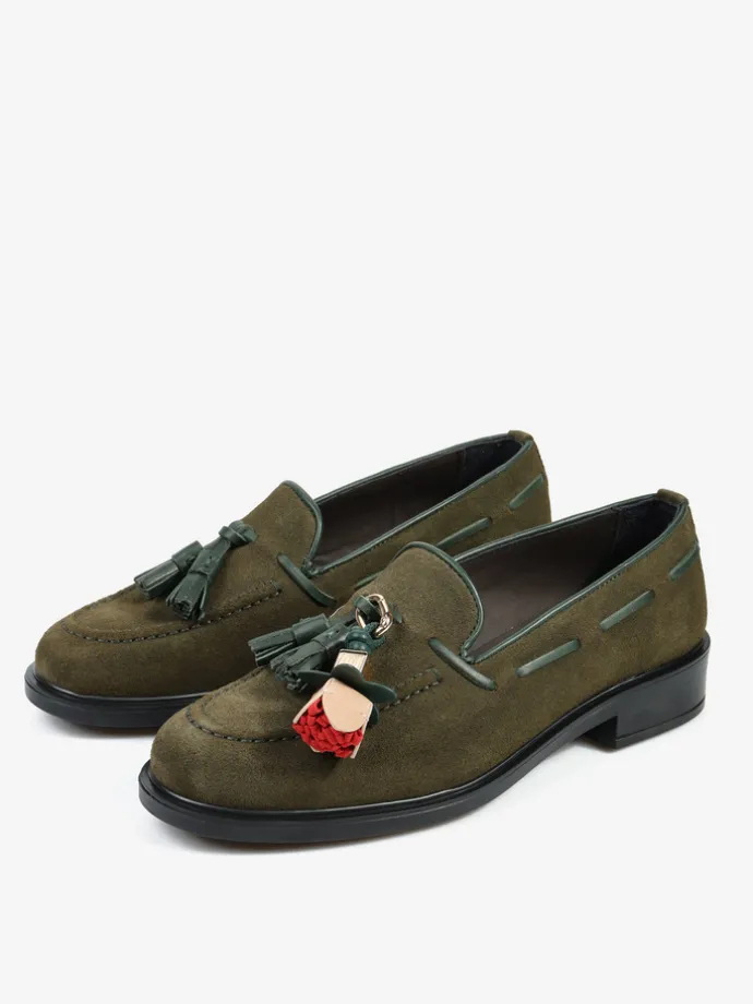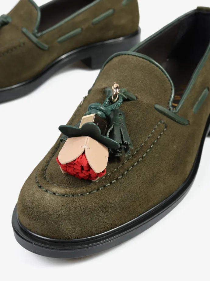 Zamszowe mokasyny z ozdobnym rzemykiem i frędzlami. Przywieszka dostępna oddzielnie.