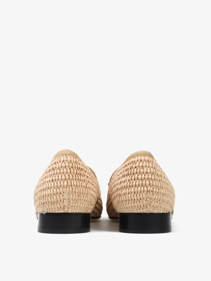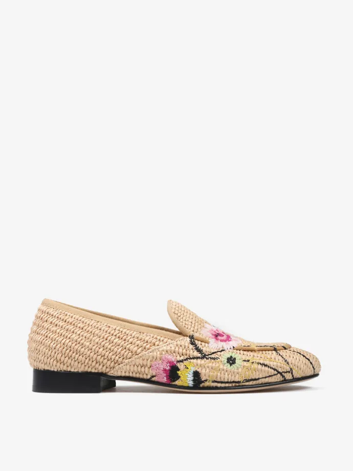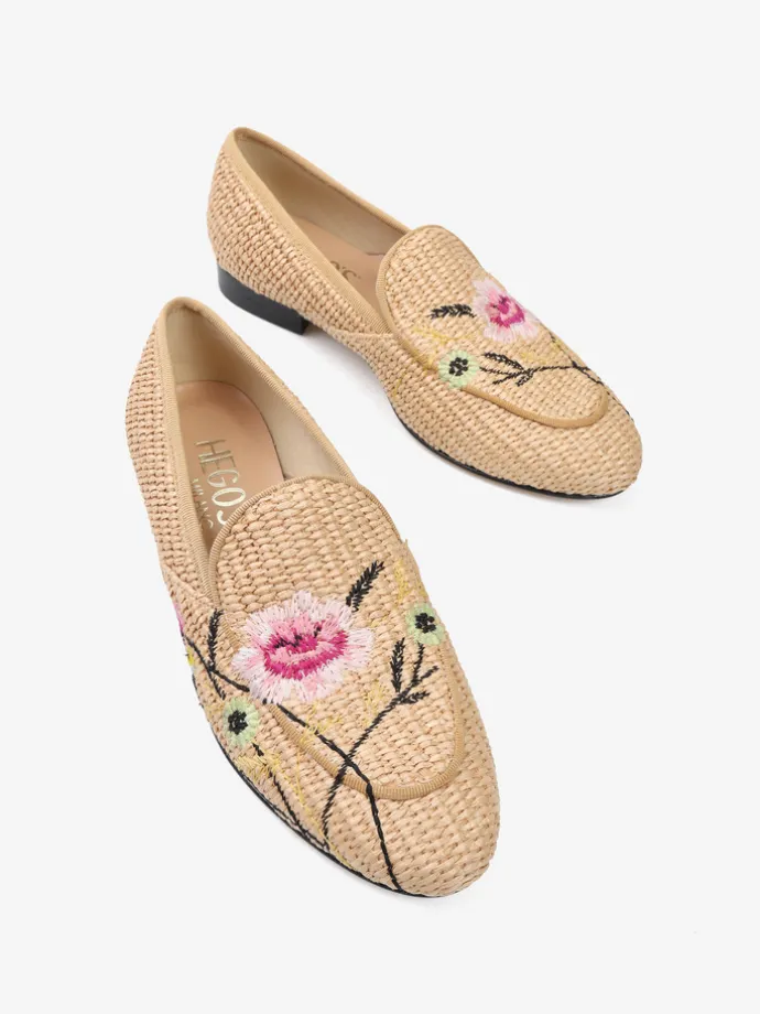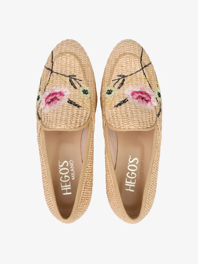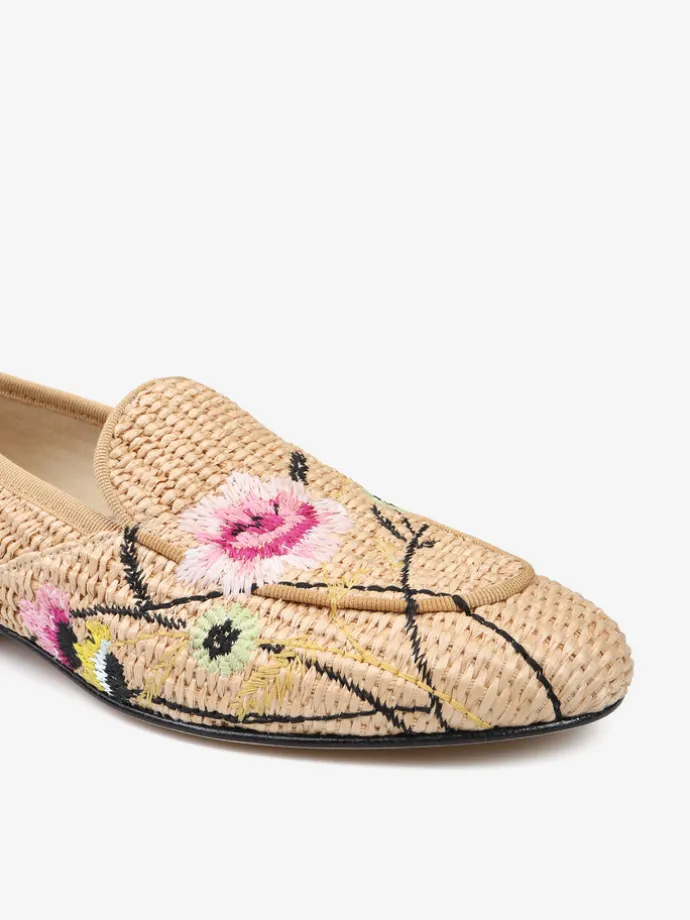 Mokasyny wykonane z rafii z ozdobnymi, haftowanymi kwiatami.