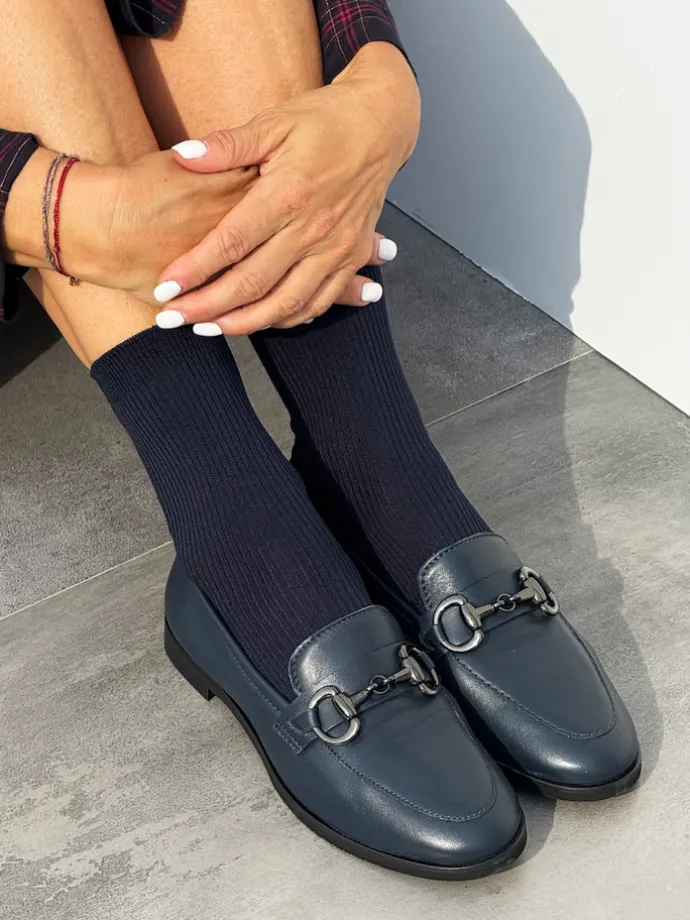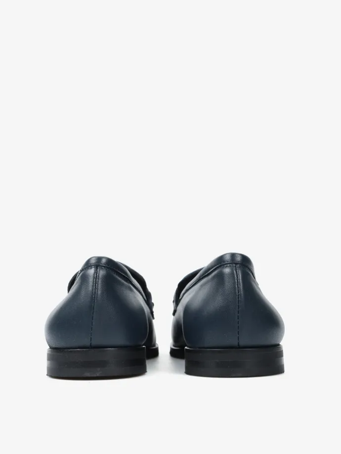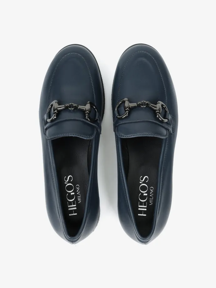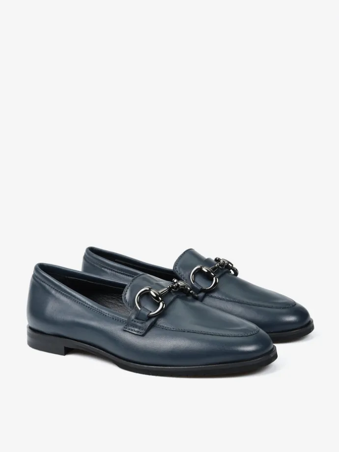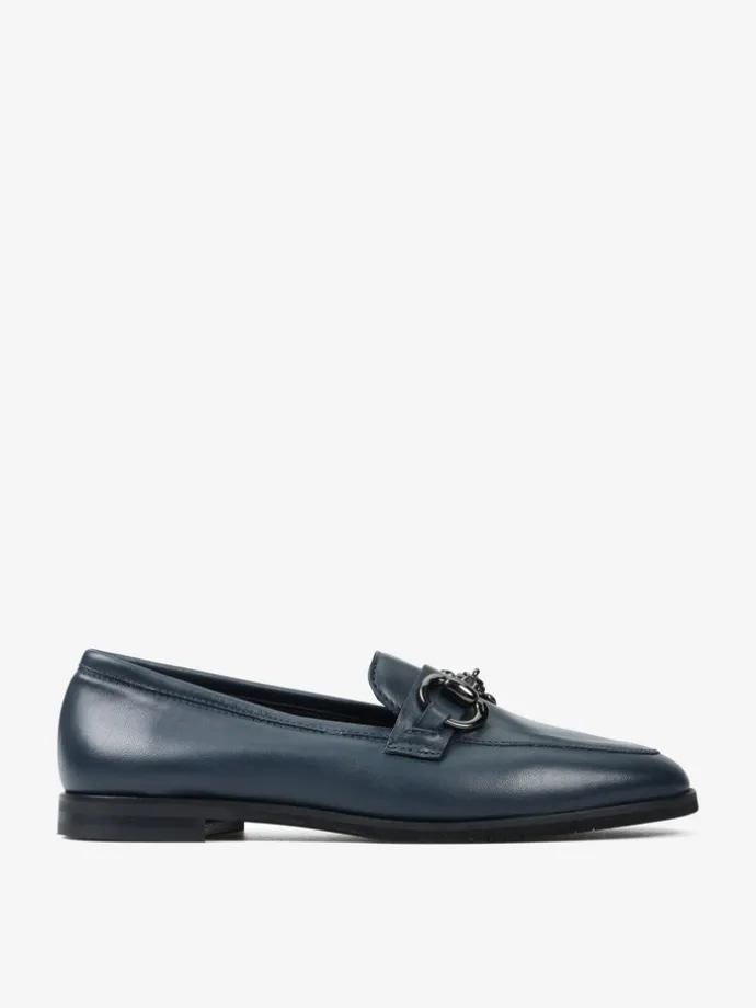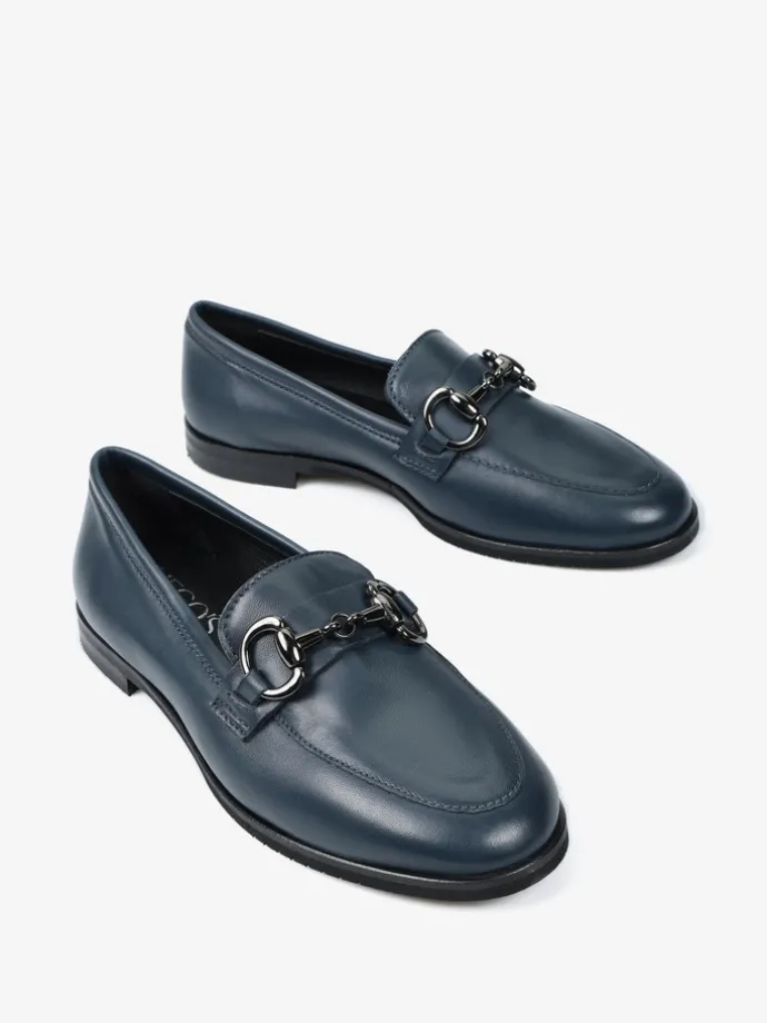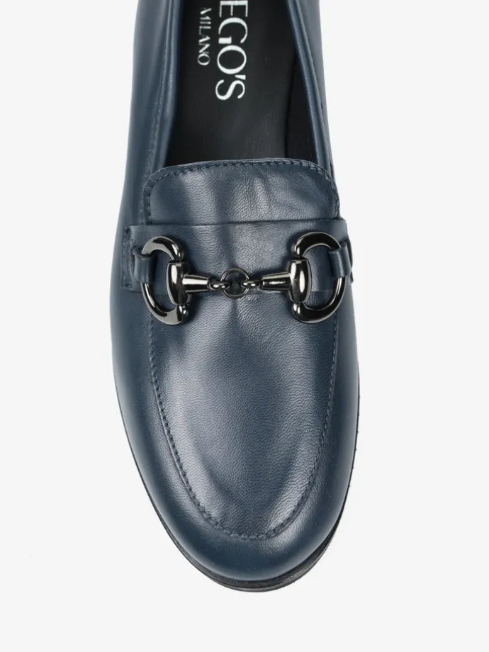Mokasyny na płaskim obcasie wykonane są z włoskiej skóry naturalnej. Granatowa cholewka ozdobiona została wędzidłem. Wykonane z miękkiej i delikatnej skóry.