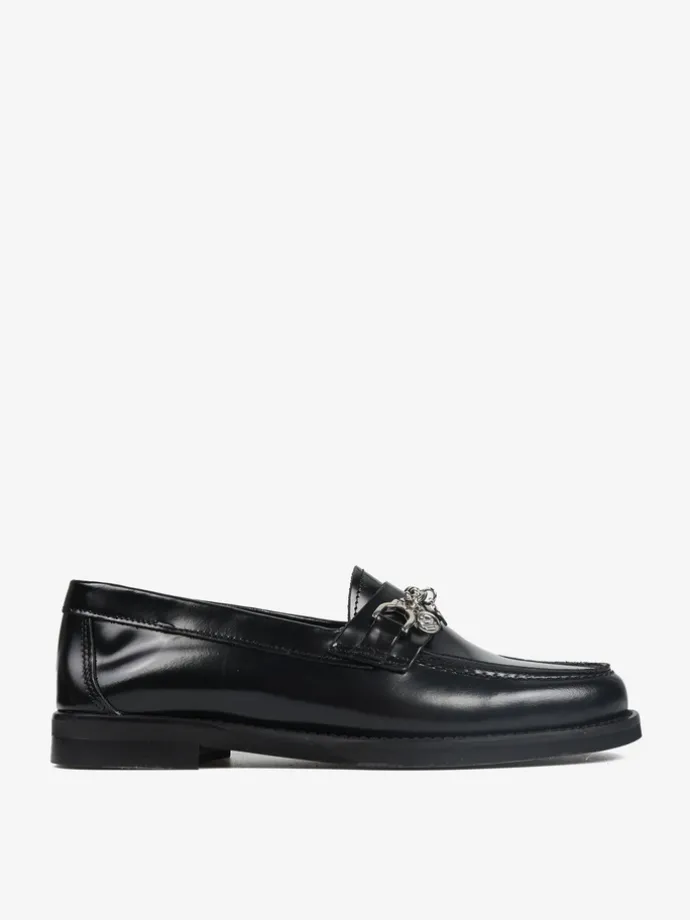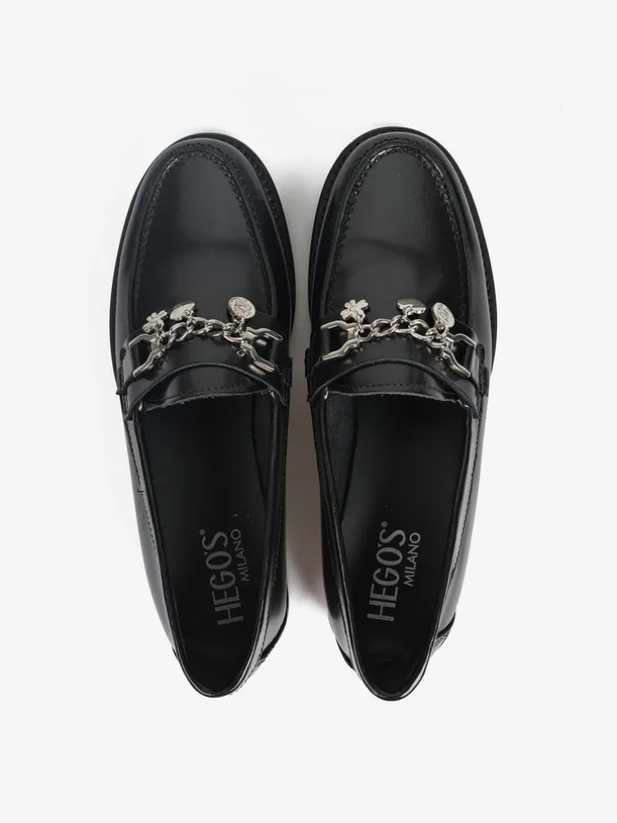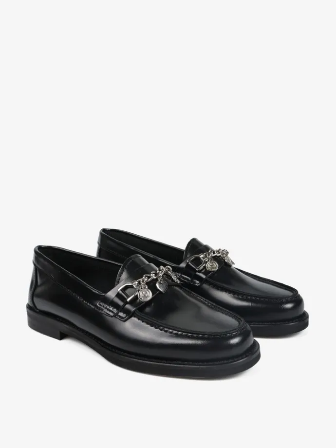 Klasyczne mokasyny wykonane z wysokopolerowanej skóry. Ozdobna patka z łańcuszkiem i zawieszkami.