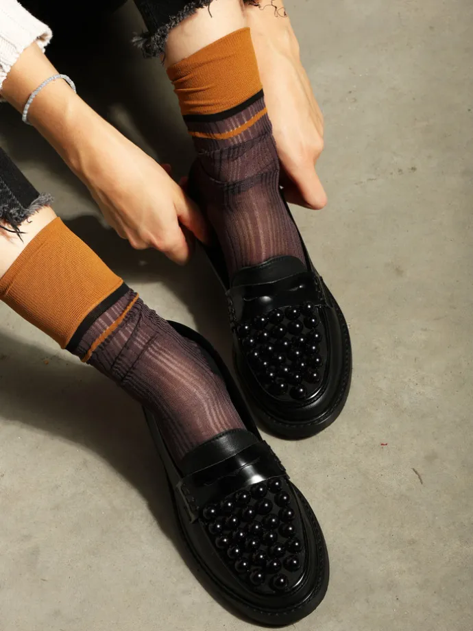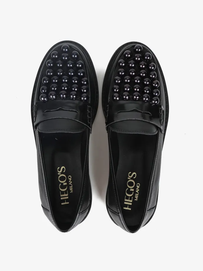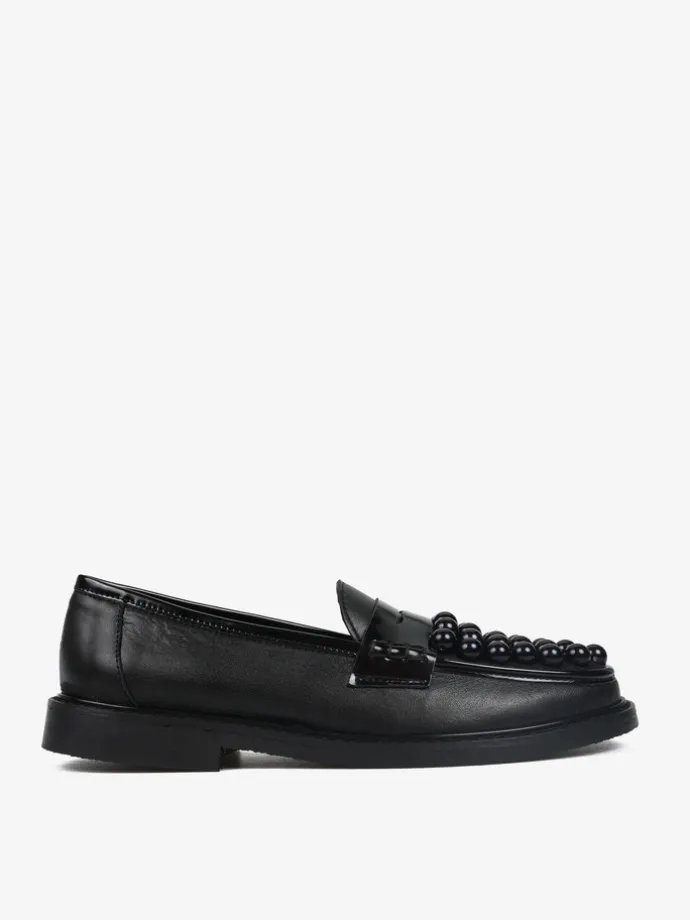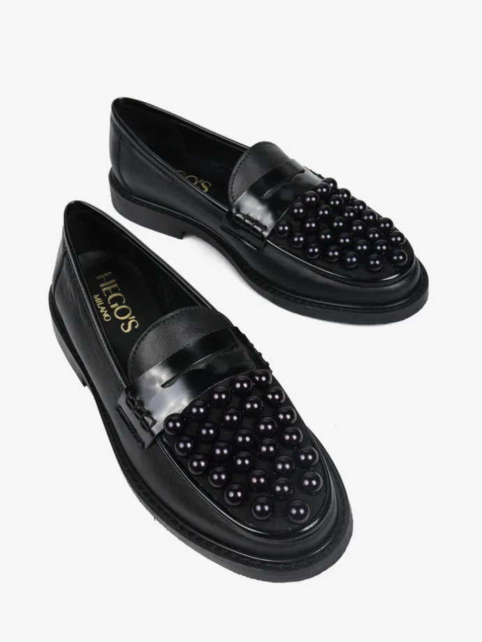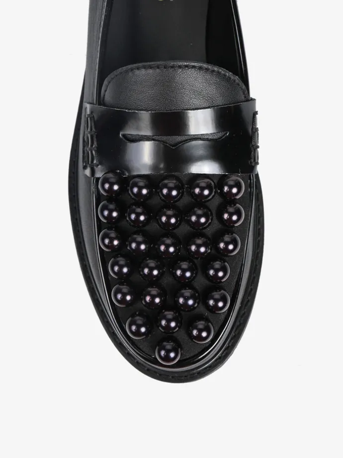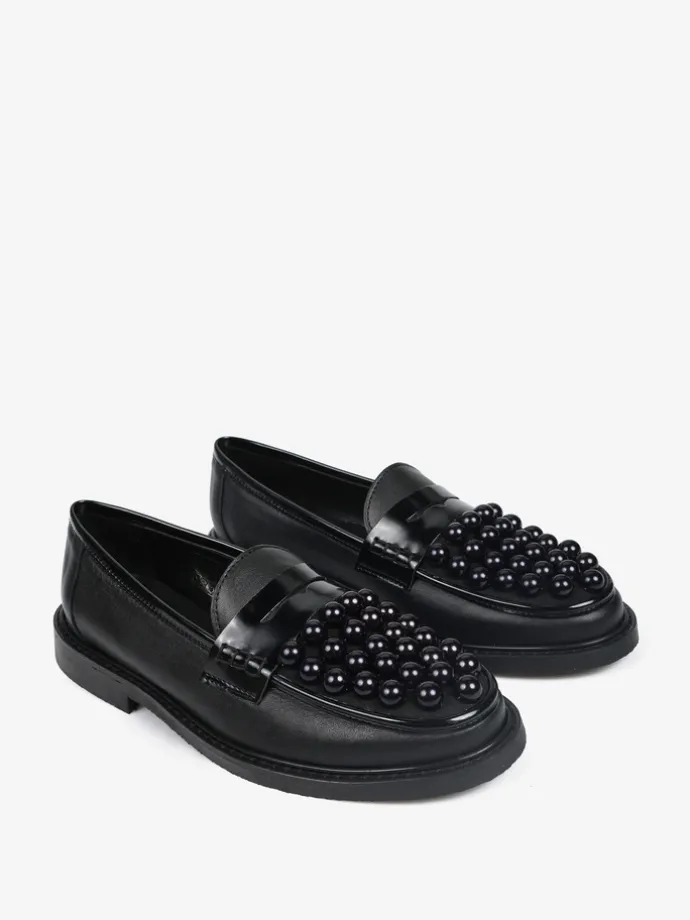 Mokasyny z ozdobnymi perłami i patką z połyskiem. Wykonane z miękkiej, delikatnej skóry.