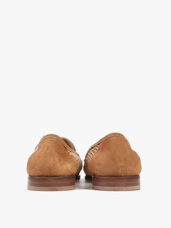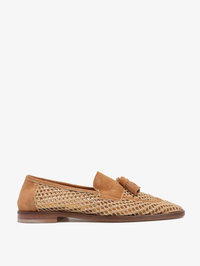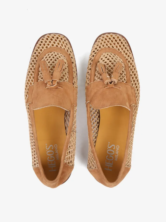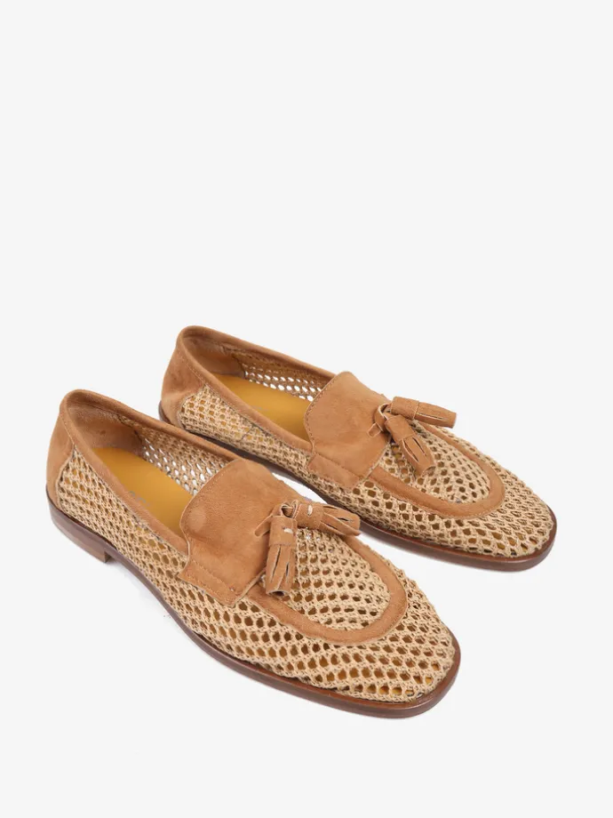 Mokasyny z ażurowej plecionki. Zamszowa pięta, lamówka, język i ozdobne frędzle.