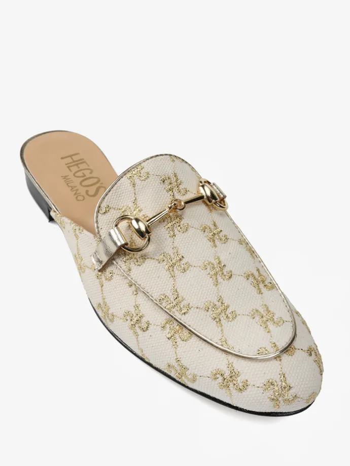 Materiałowe mule z haftowanym monogramem i złotym wędzidłem.