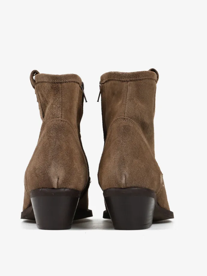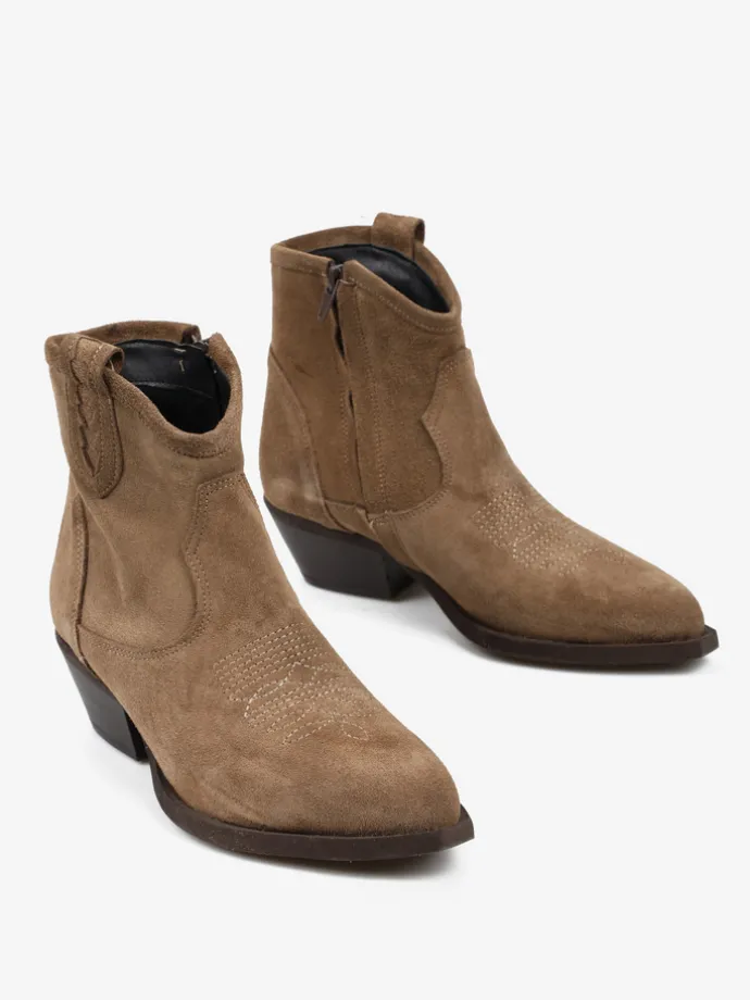 Niskie, zamszowe kowbojki z monochromatycznym haftem na nosku i zapięciem na suwak przy kostce.