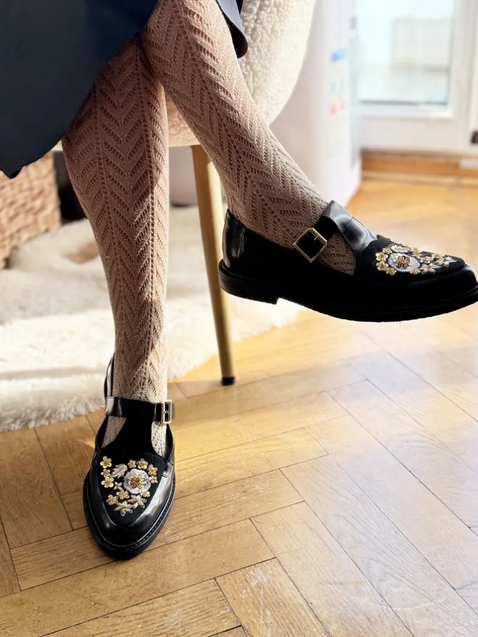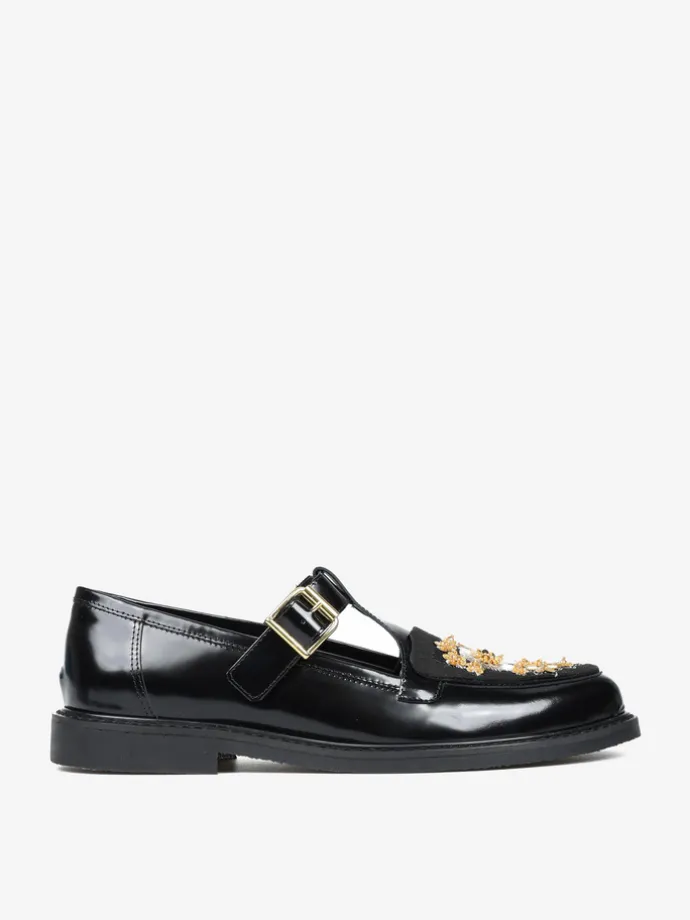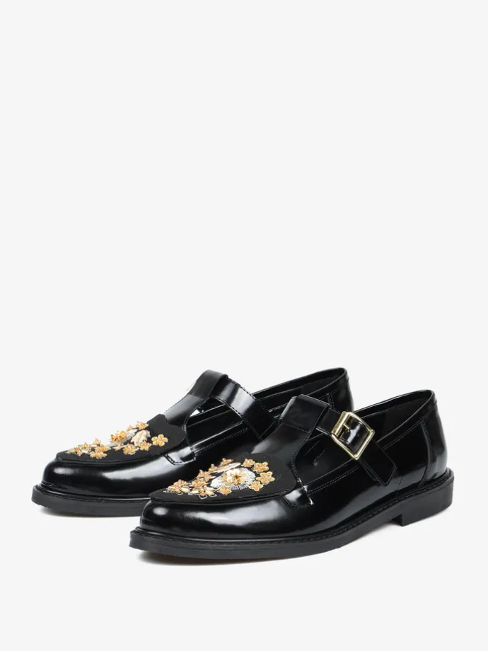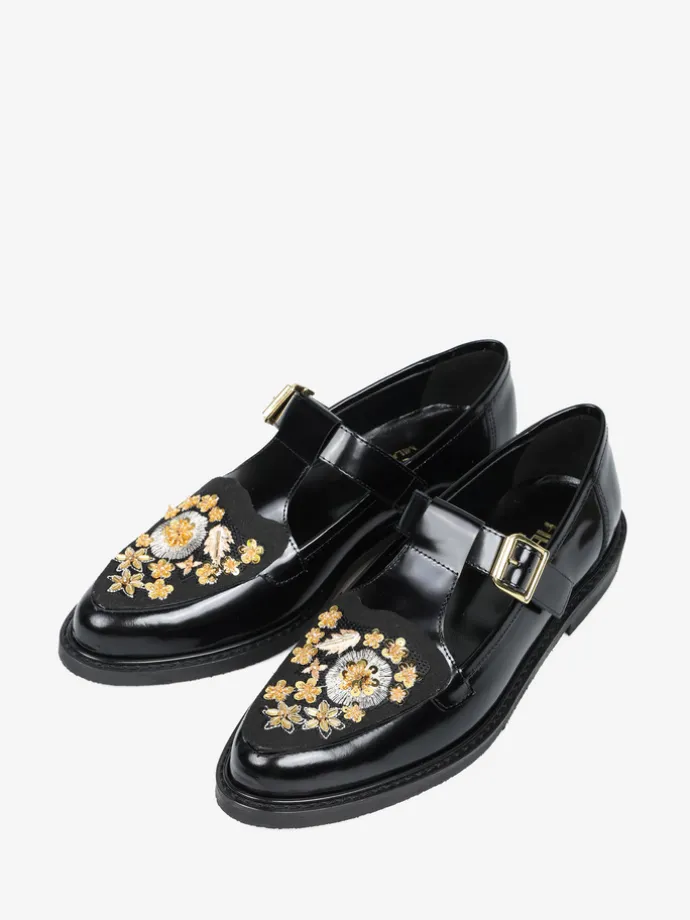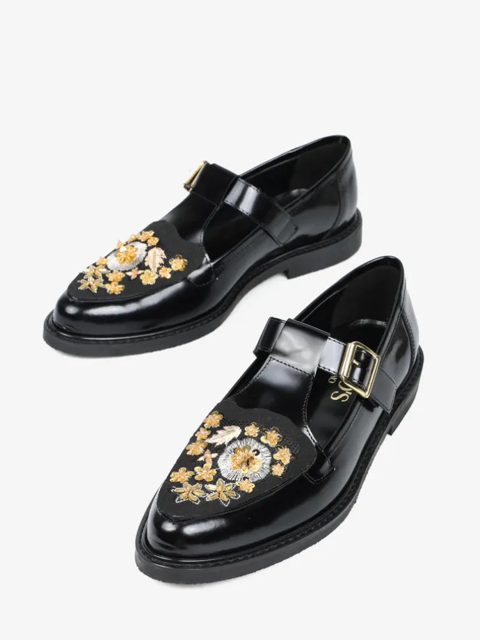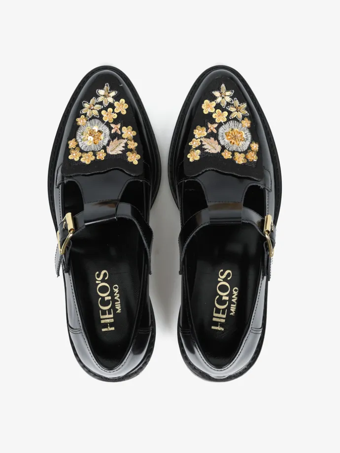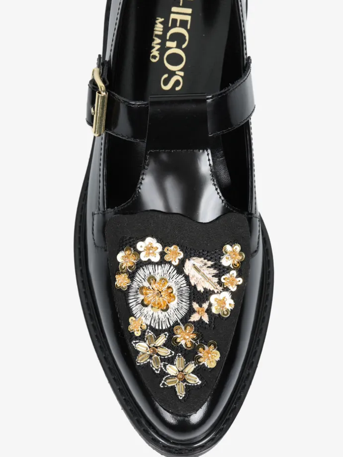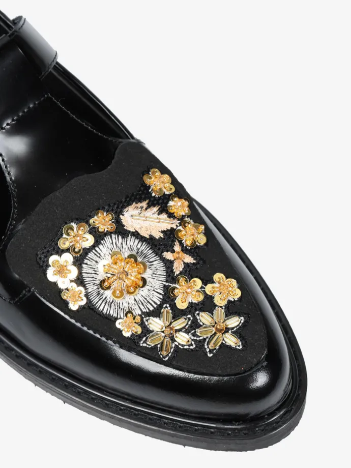 Półbuty wykonane z wysokopolerowanej skóry. Regulowane zapięcie i ozdobny haft z cekinami i koralikami.