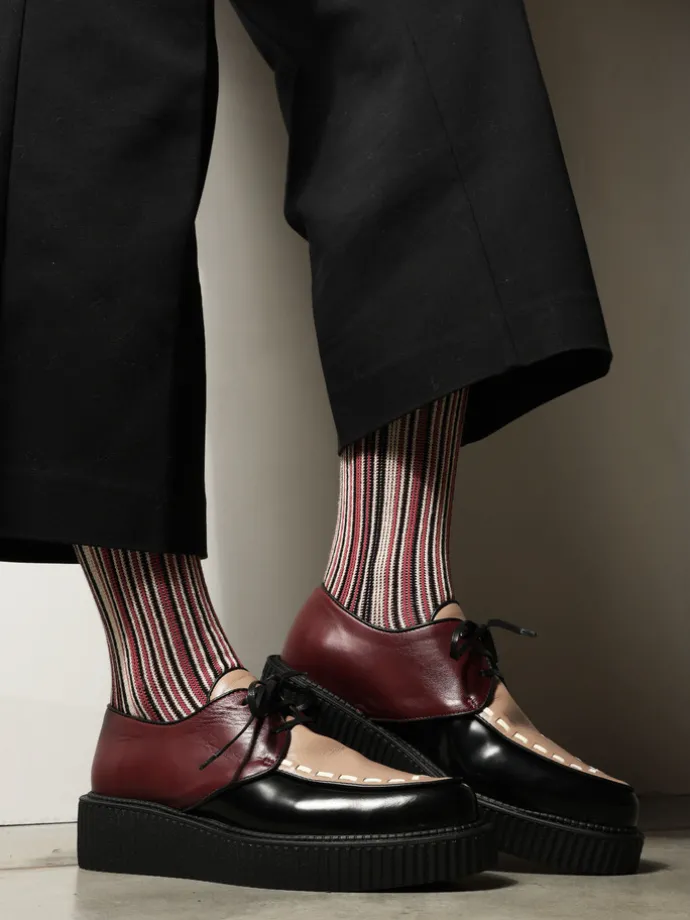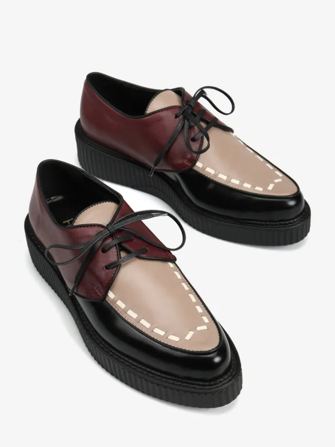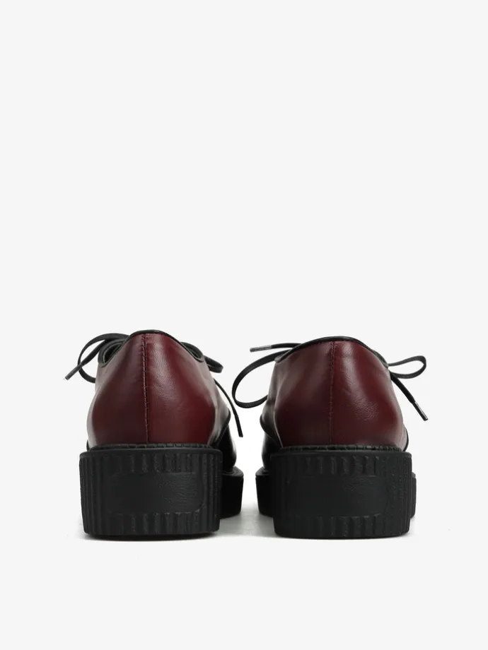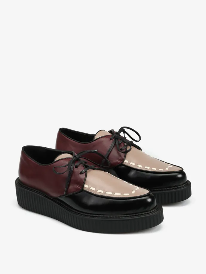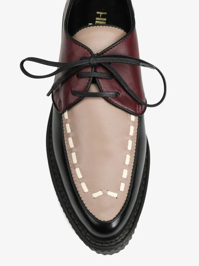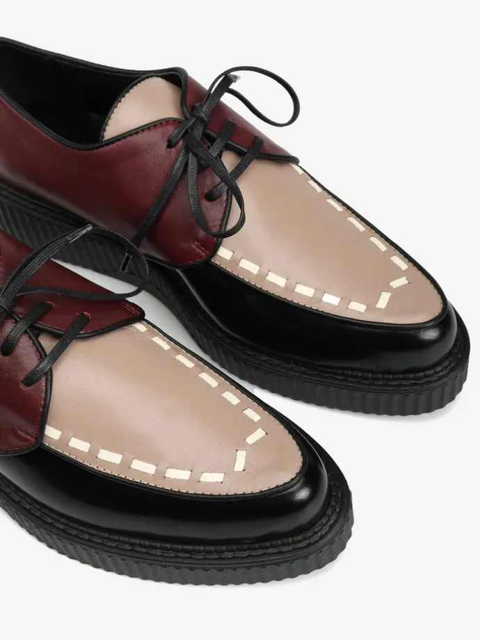 Wiązane półbuty na platformie, wykonane ze skóry naturalnejj. Kontrastujący język z ozdobnym, grubym szwem.