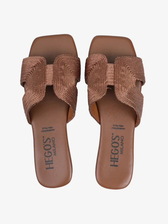 Modne klapki na płaskiej podeszwie z paskiem wykonanym ze sznurka.