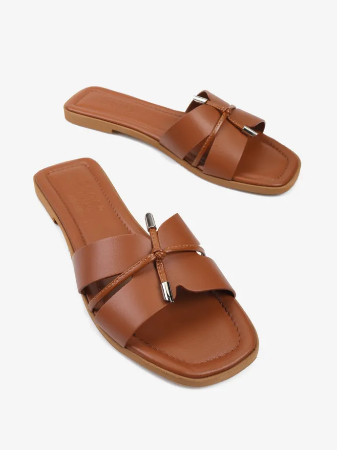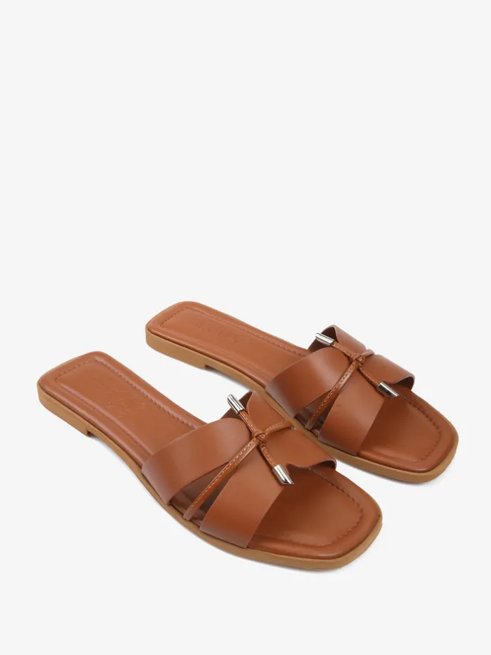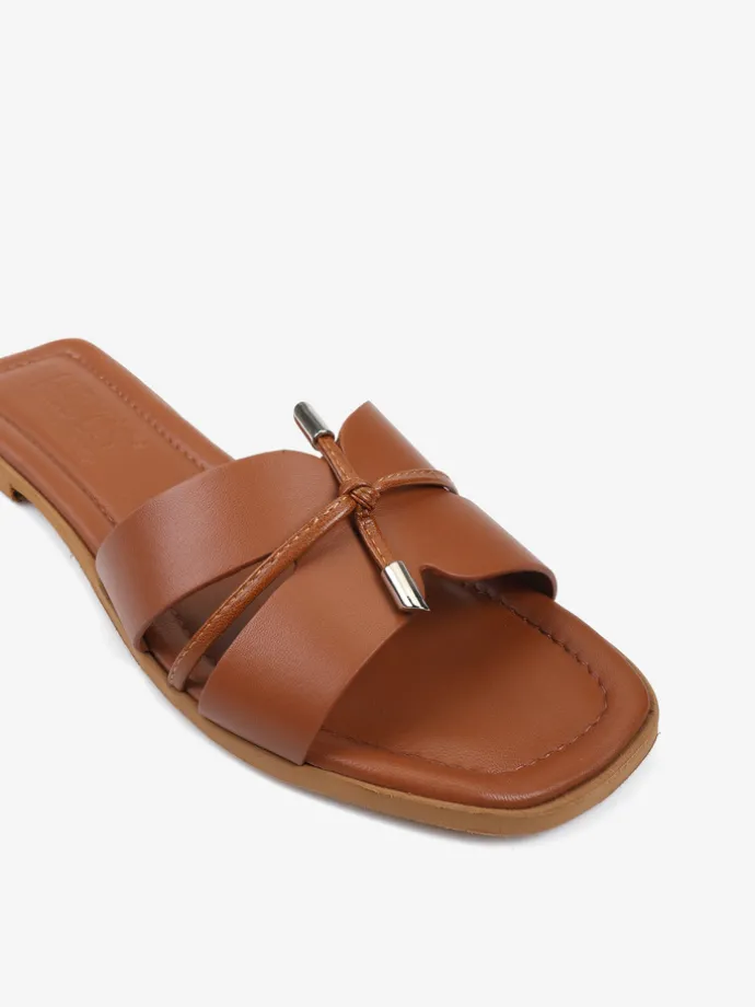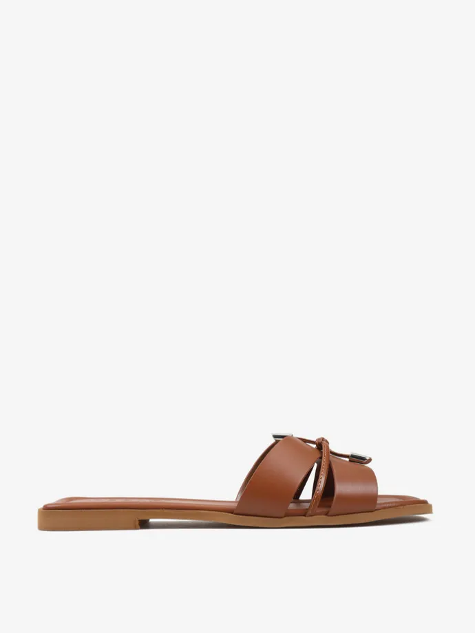 Modne klapki wykonane z miękkiej, delikatnej skóry. Ozdobne wiązanie ze skórzanego sznurka wykończonego metalowymi skuwkami.