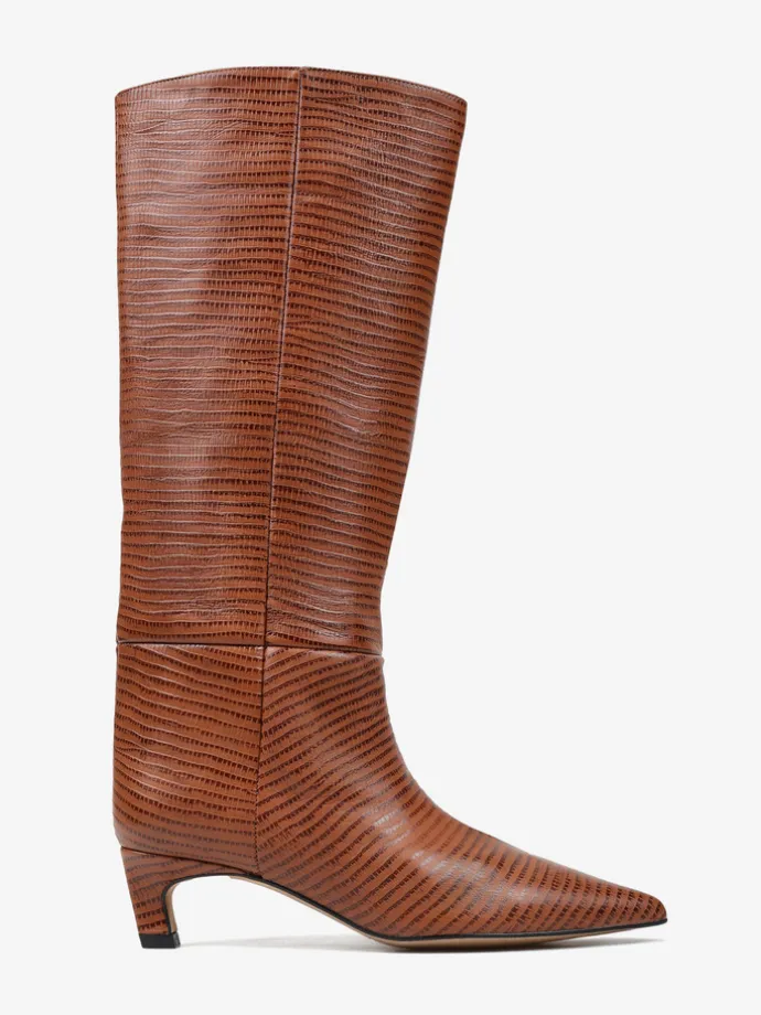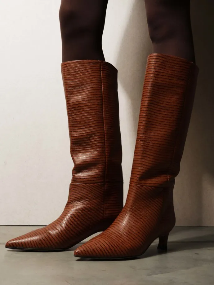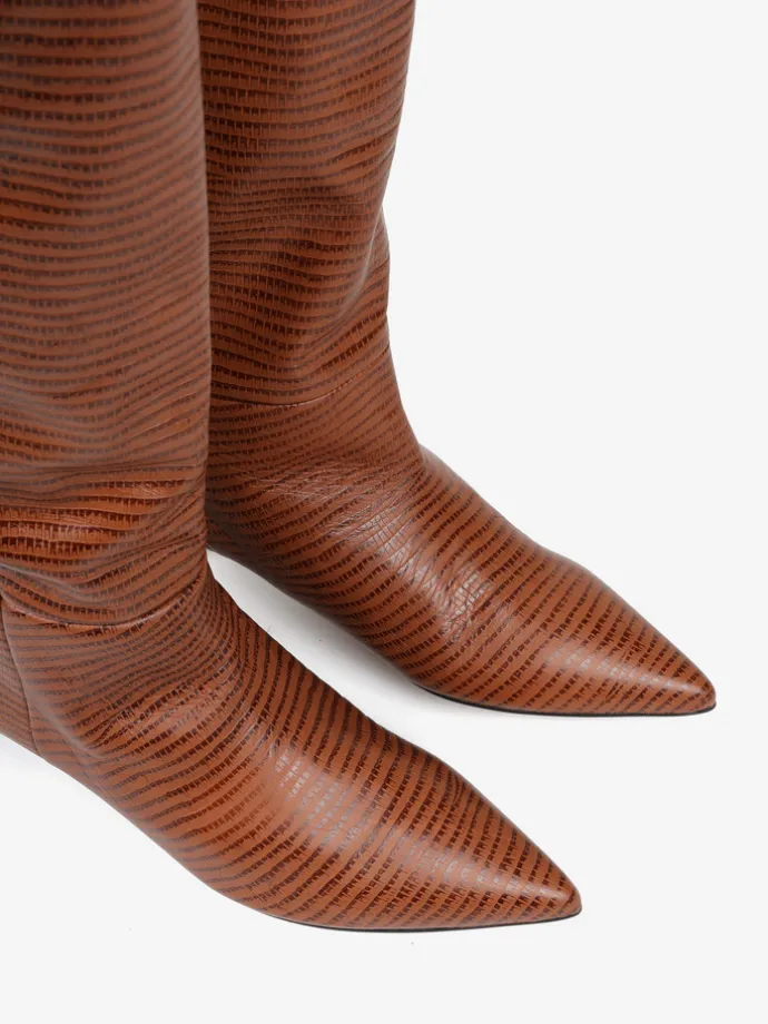 Kozaki na szpilce wykonane z rudej skóry tłoczonej w wężowy wzór. Rozszerzana cholewka i noski w szpic.