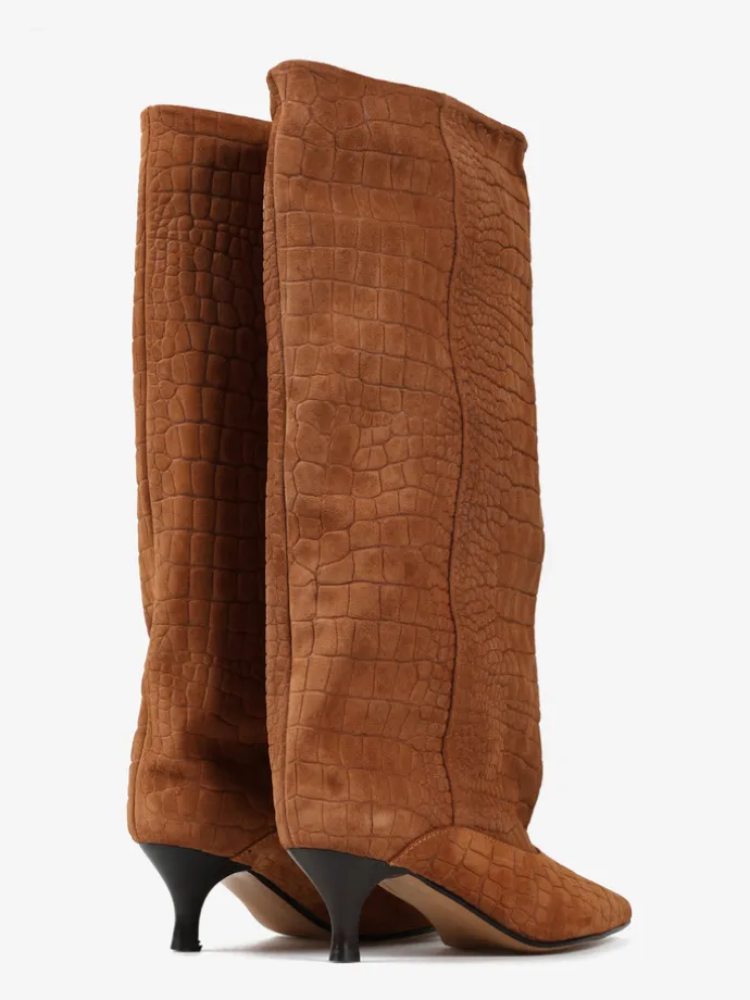 Kozaki na szpilce wykonane z zamszu tłoczonego w krokodyli wzór. Szeroka cholewka i noski w szpic.