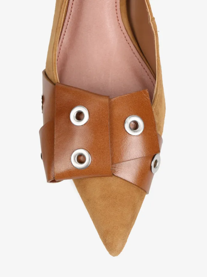 Zamszowe szpilki z noskiem w szpic i skórzaną aplikacją z ćwiekami.