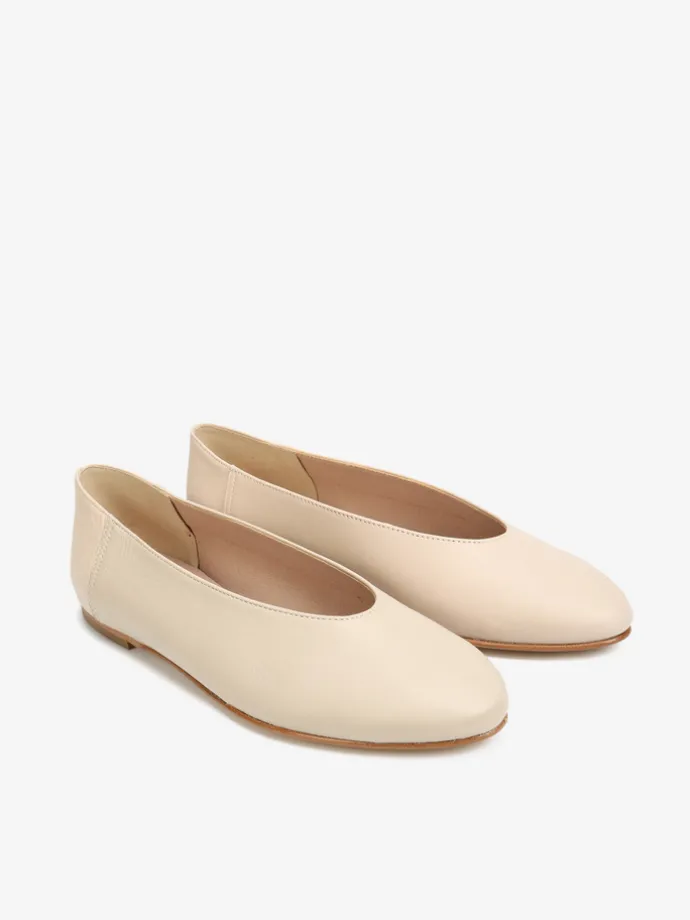Proste baleriny z owalnym wycięciem i zabudowanymi brzegami na skórzanej podeszwie, wykonane z delikatnej, miękkiej skóry.