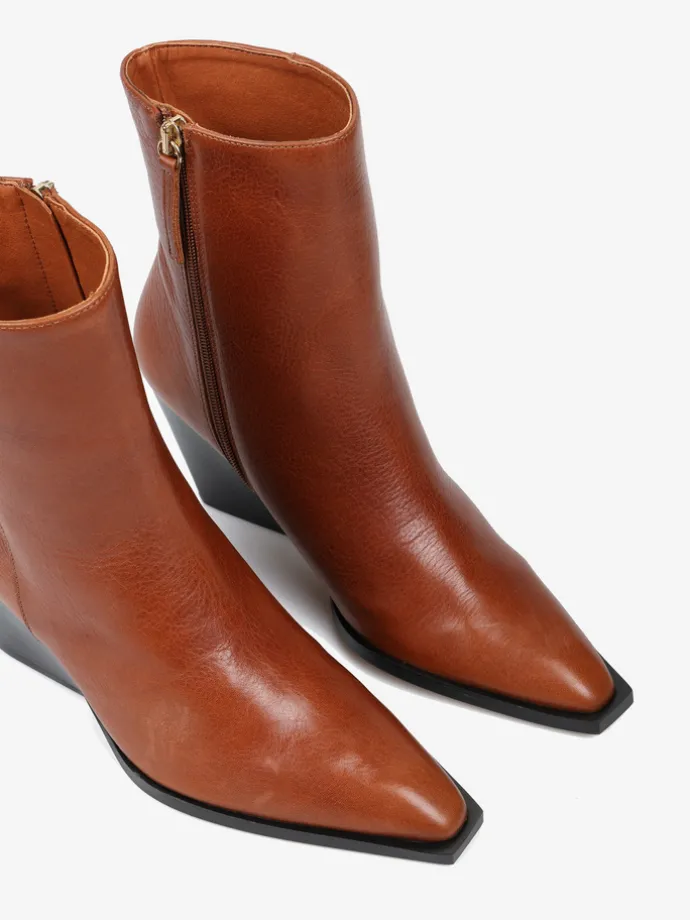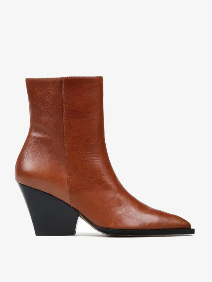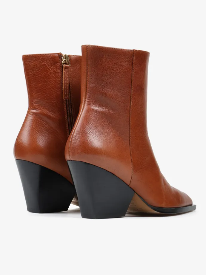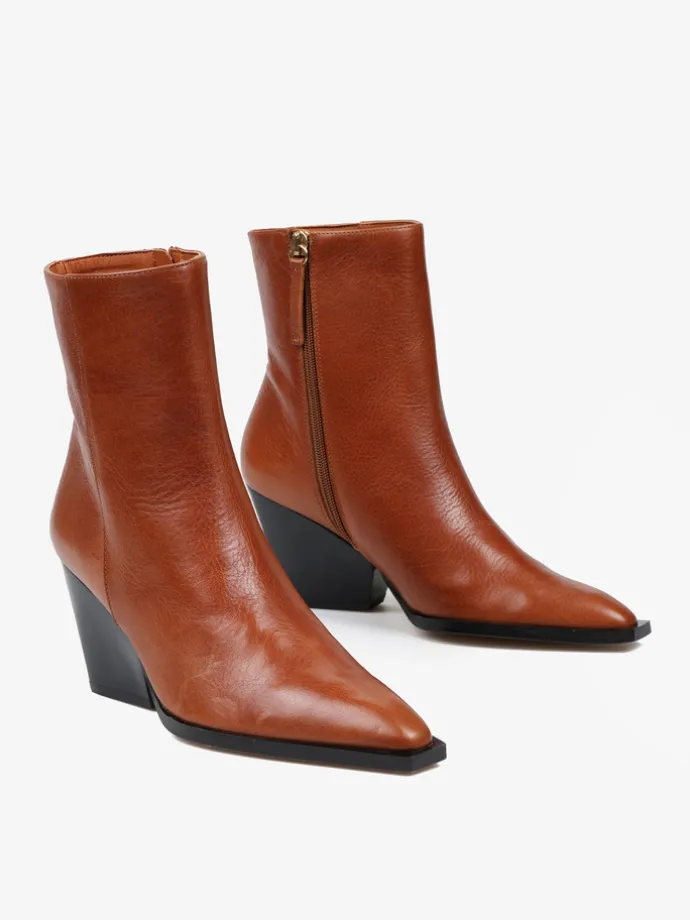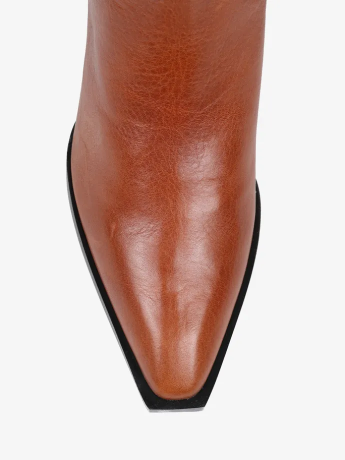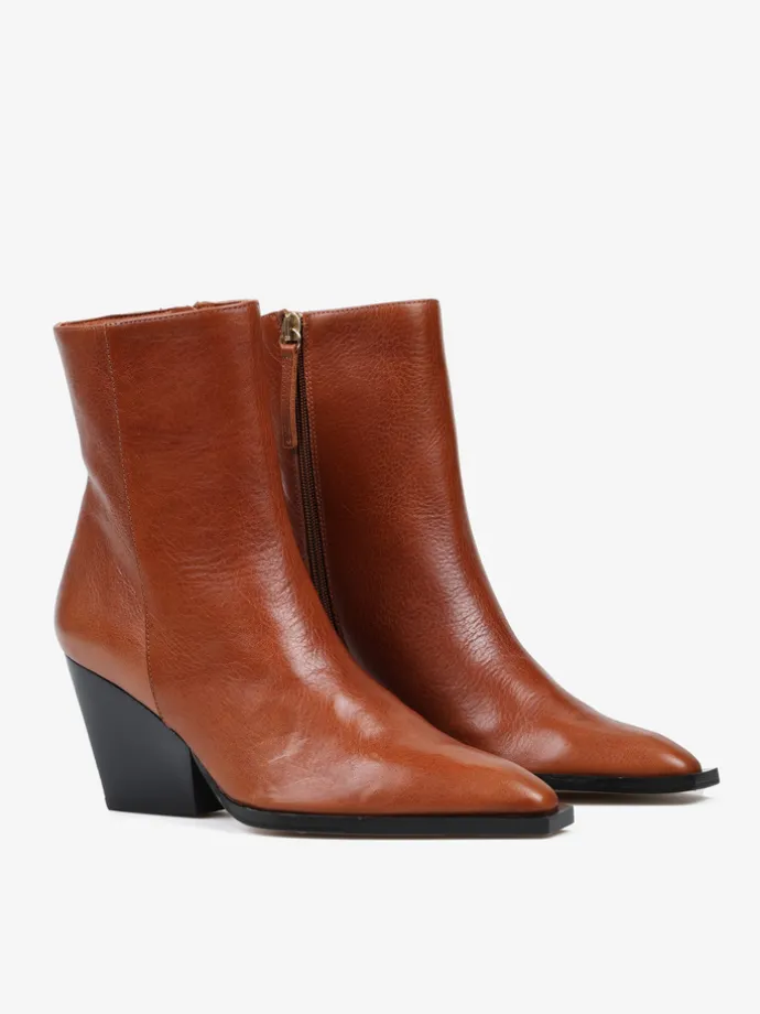 Kowbojki na masywnym, ściętym słupku. Wydłużone noski i zapięcie na suwak.