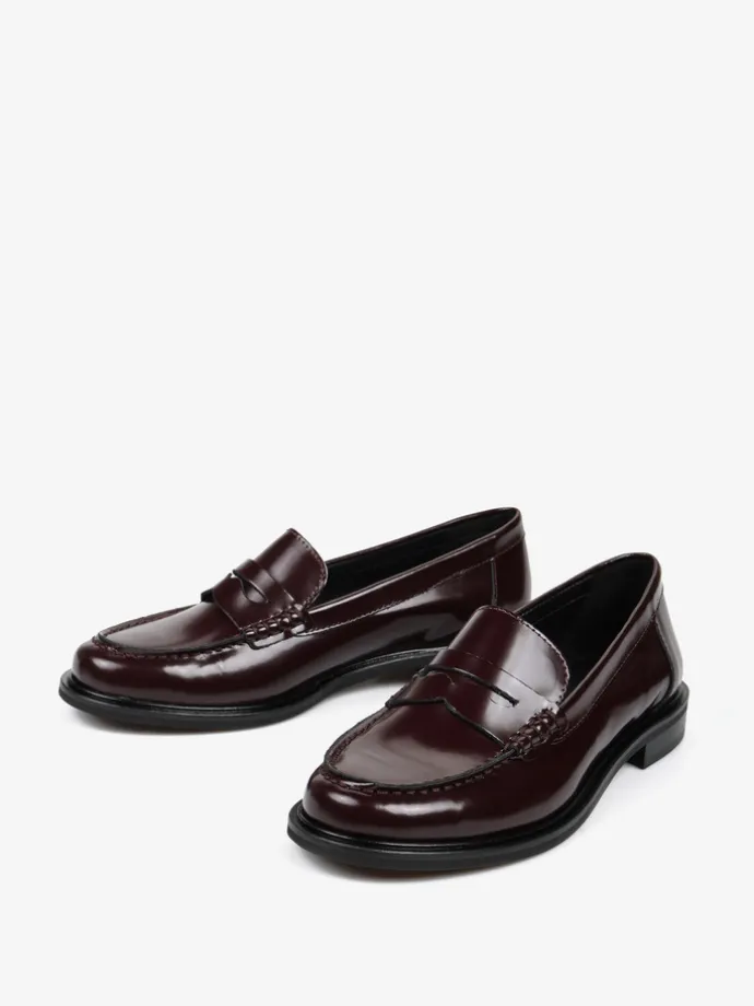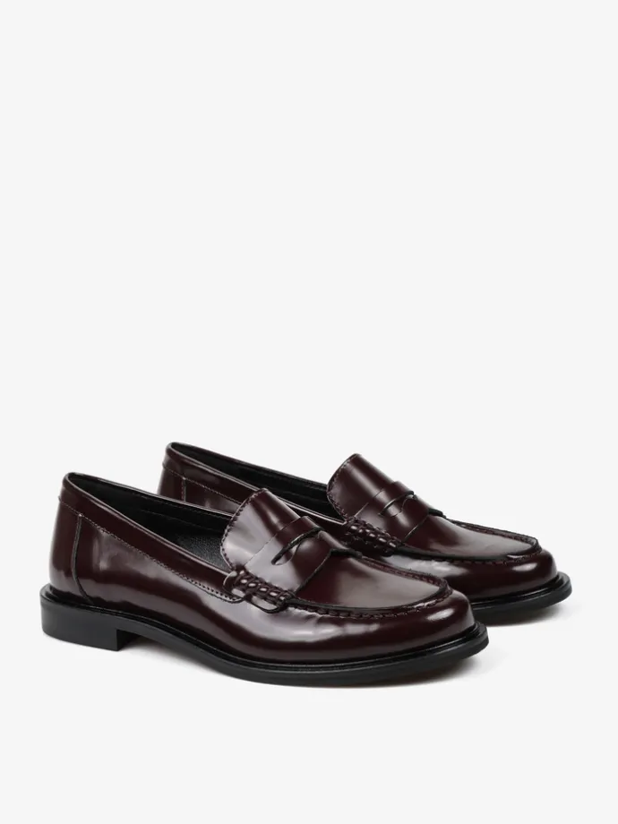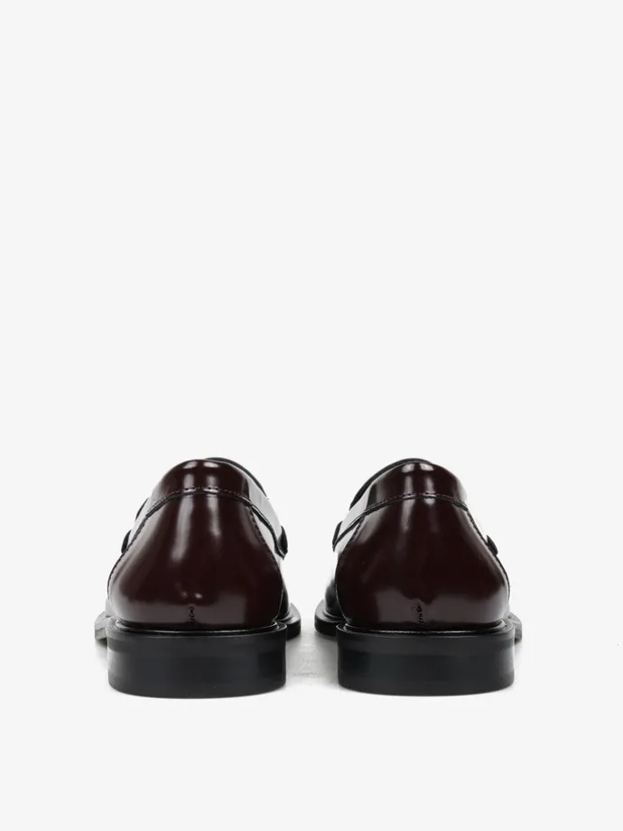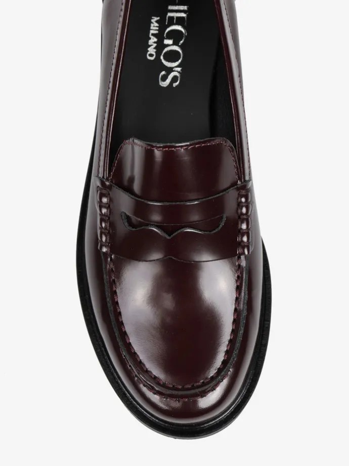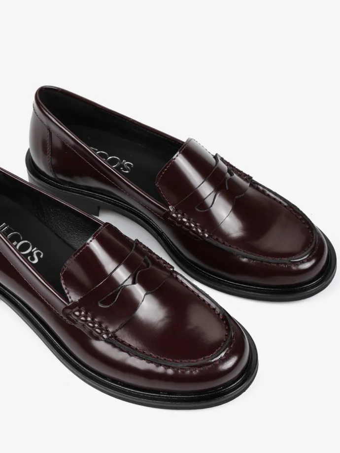 Klasyczne mokasyny college z ozdobną patką i wysokim językiem. Wykonane z bordowej skóry wysoko polerowanej.