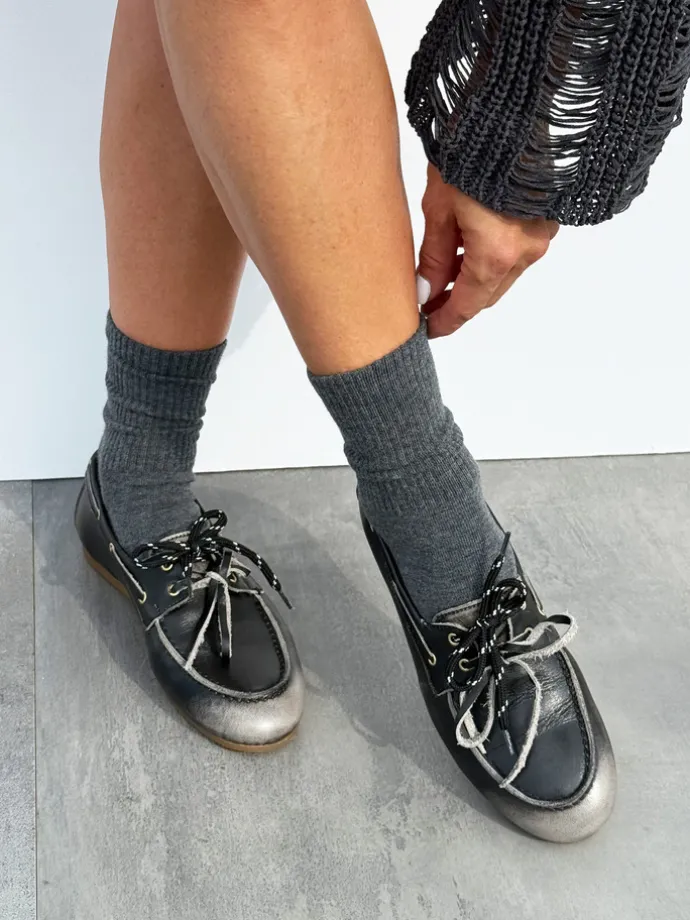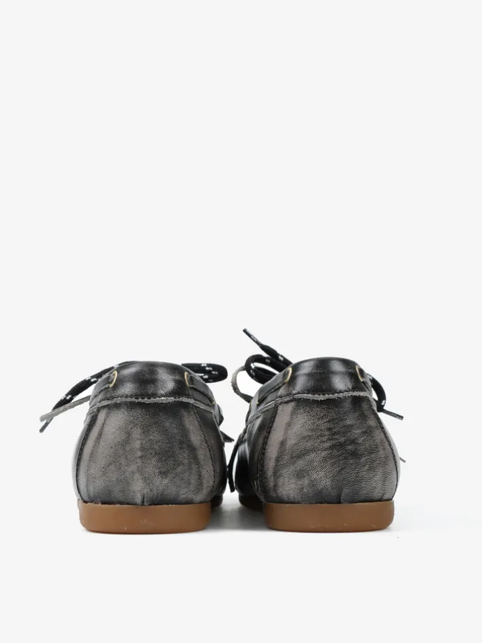 Mokasyny wykonane ze skóry z efektem sprania, z wiązaniem pozwalającym na idealne dopasowanie. Dodatkowa para czarnych sznurowadeł.