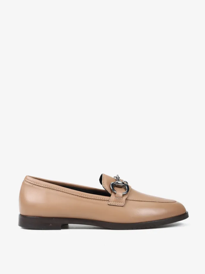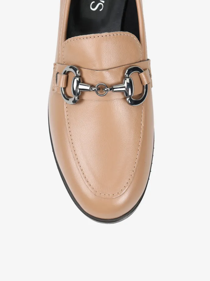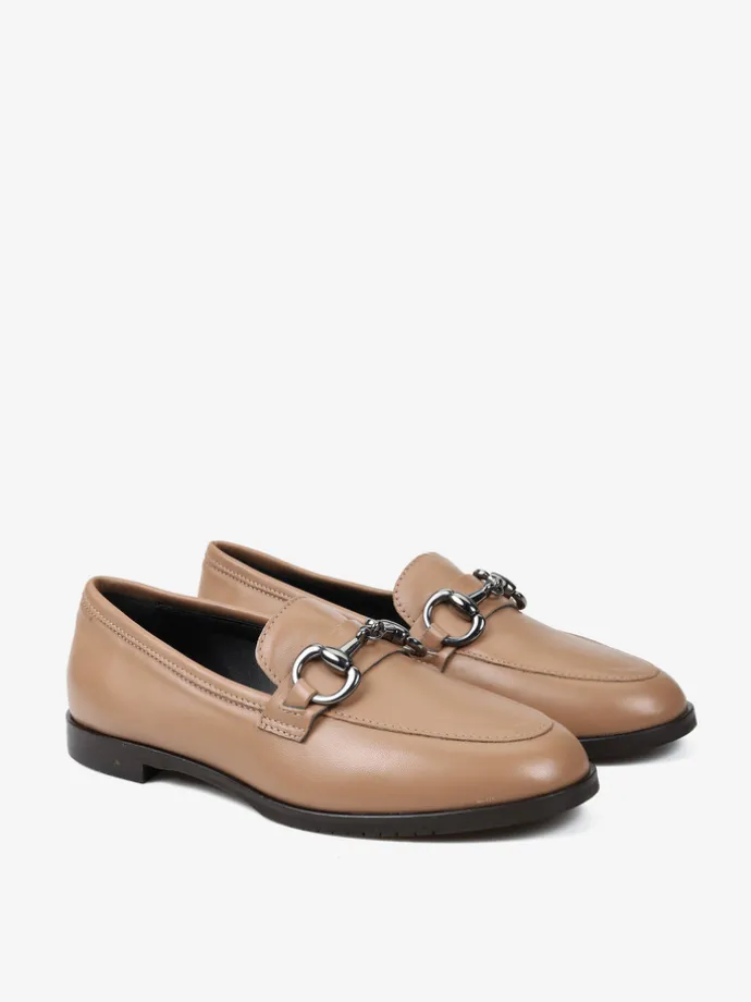 Mokasyny na płaskim obcasie wykonane są z włoskiej skóry naturalnej. Cholewka w kolorze taupe ozdobiona została wędzidłem. Wykonane z miękkiej i delikatnej skóry.
