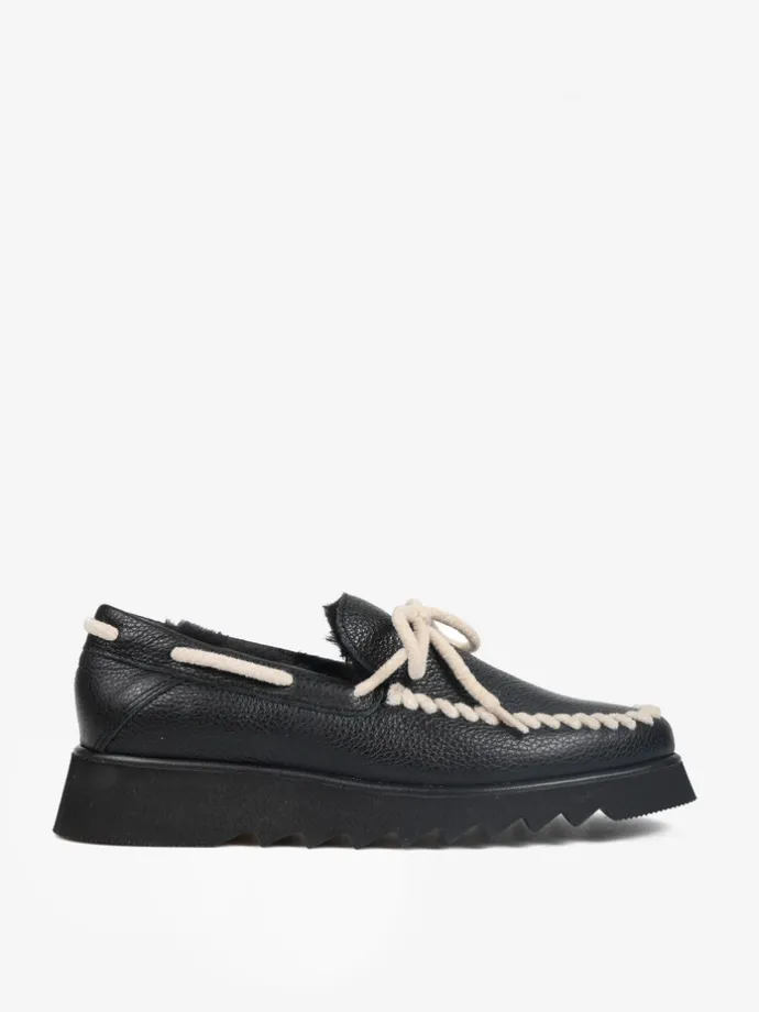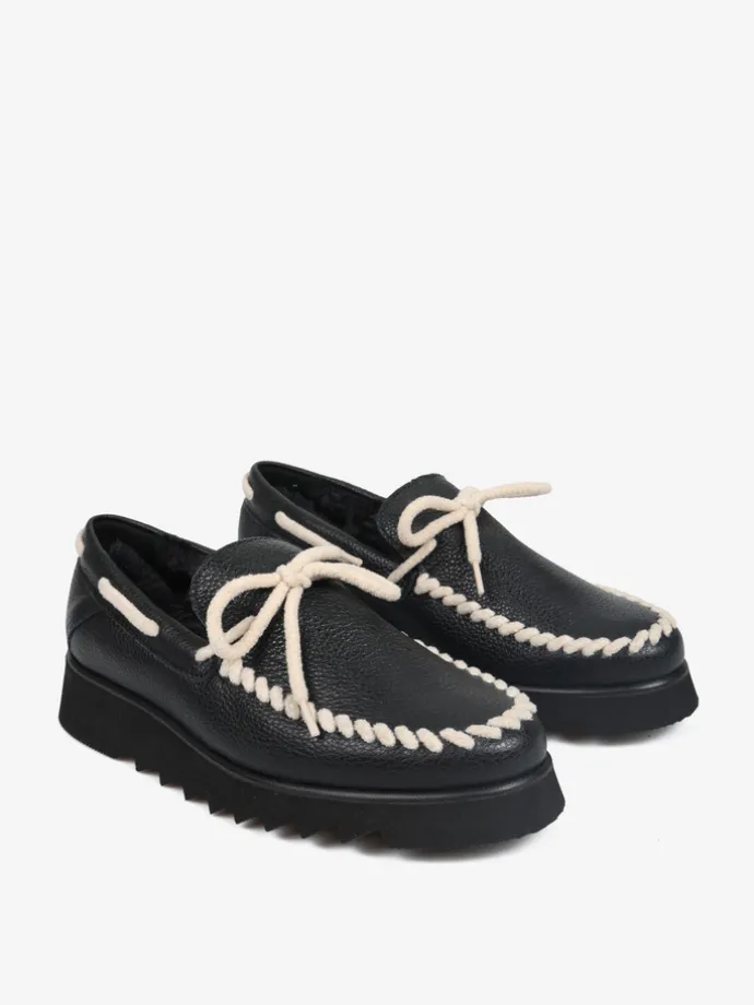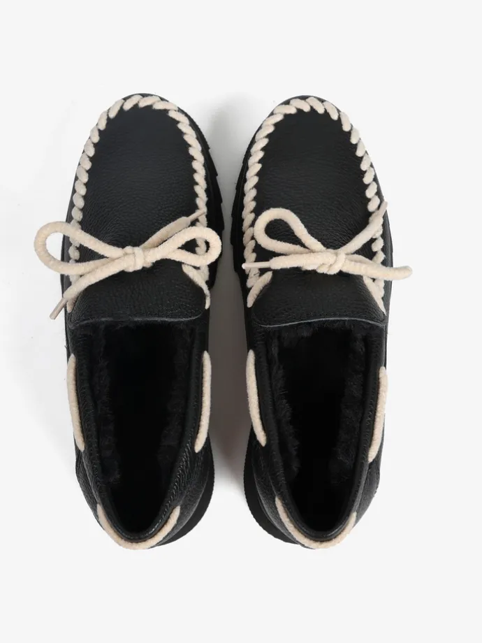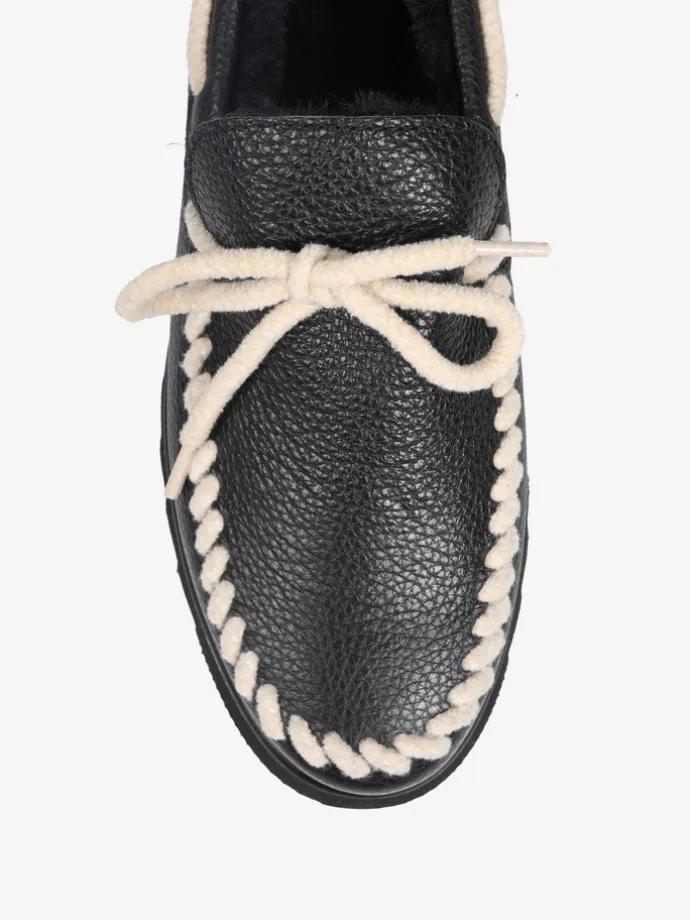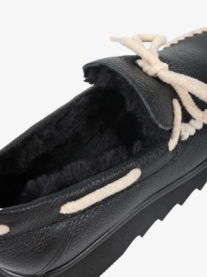 Skórzane mokasyny na efektownej podeszwie z wnętrzem wyłożonym miękkim, sztucznym futrem. Wiązanie z kremowego sznurka pozwala na idealne dopasowanie.