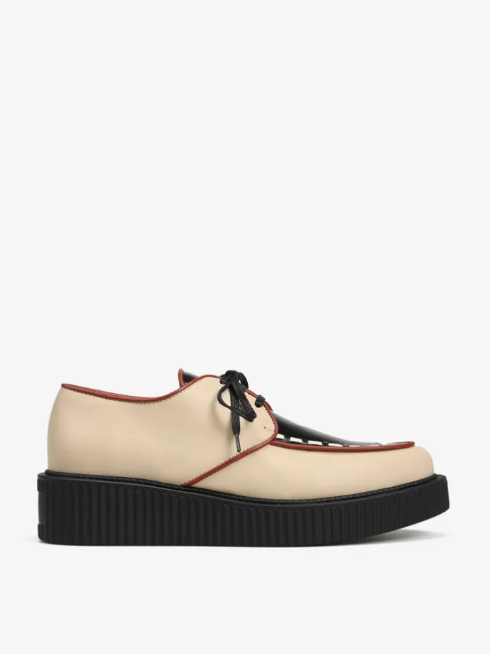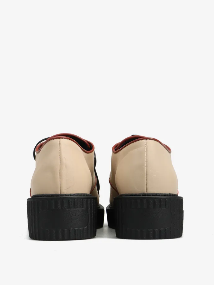 Wiązane półbuty na platformie, wykonane z miękkiej i delikatnej skóry. Kontrastujący język z ozdobnym, grubym szwem.