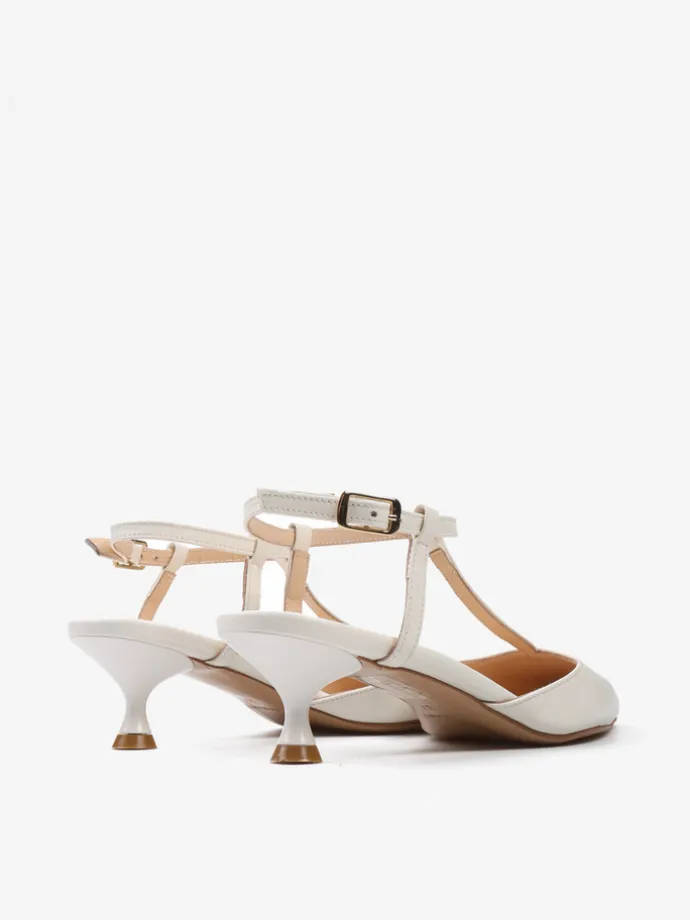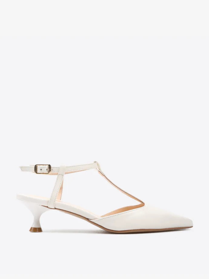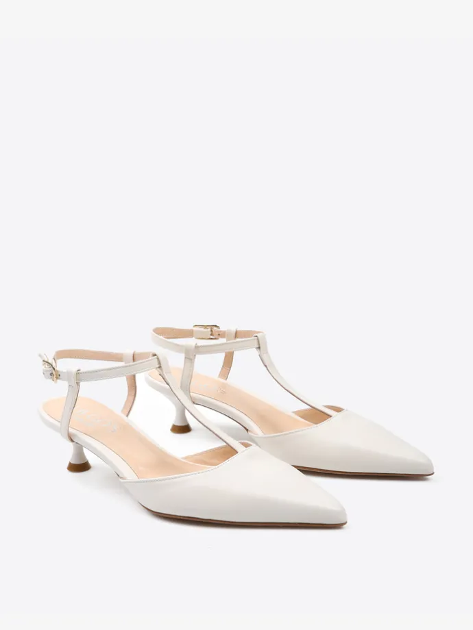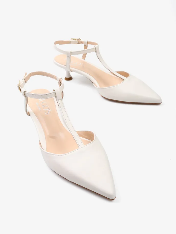 Szpilki z paskiem na podbiciu i noskiem w szpic, wykonane z miękkiej i delikatnej skóry. Odkryta pięta i regulowany pasek na kostce.